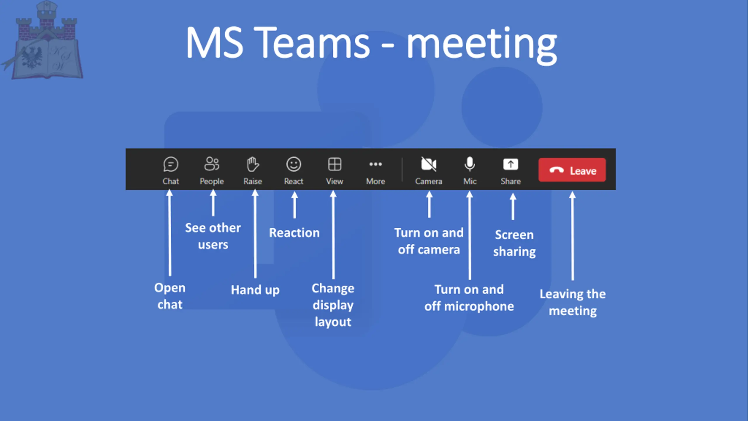 MS MS Teams Teams - - meeting meeting See other users Reaction Turn on and off camera Screen sharing Open chat Change display layout Turn on and off microphone Hand up Leaving the meeting