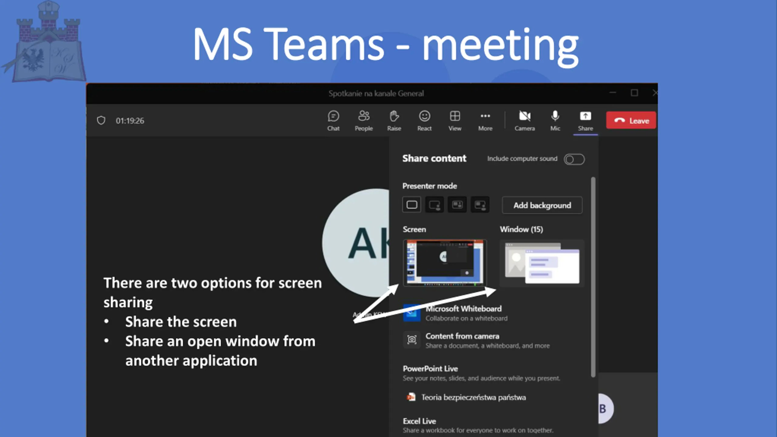MS MS Teams Teams - - meeting meeting There are two options for screen sharing Share the screen Share an open window from another application