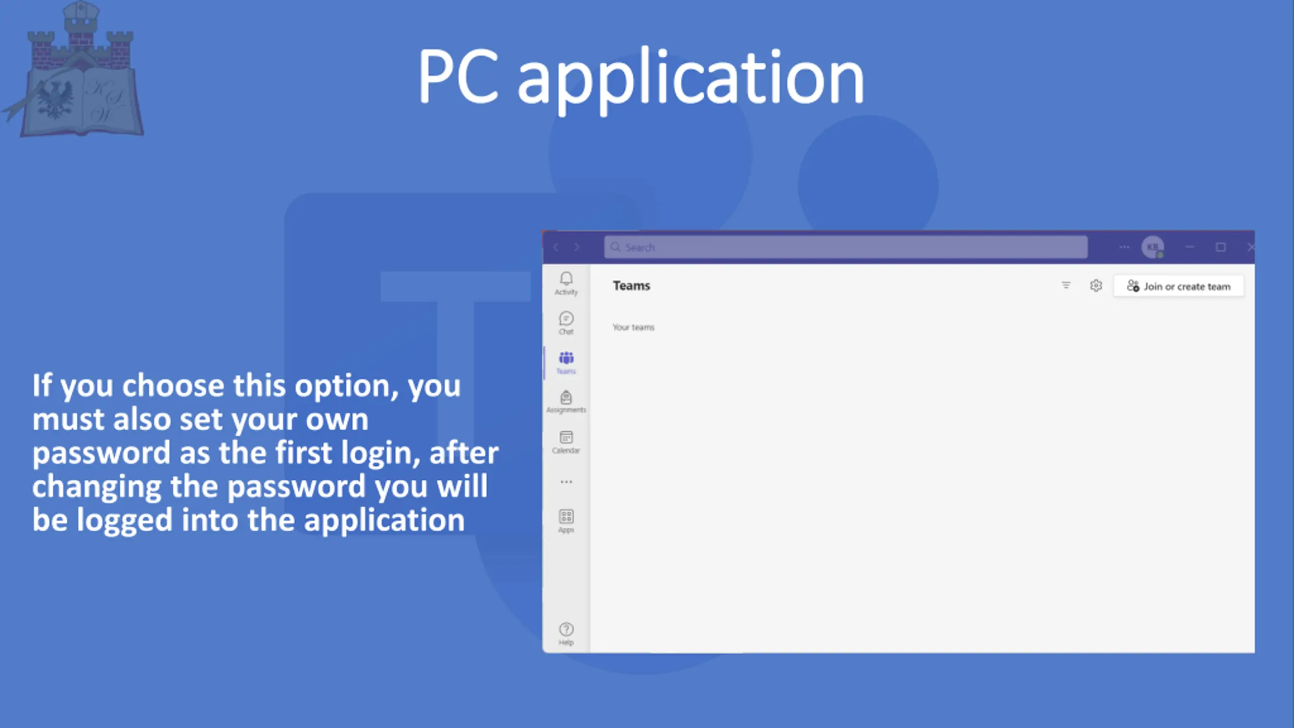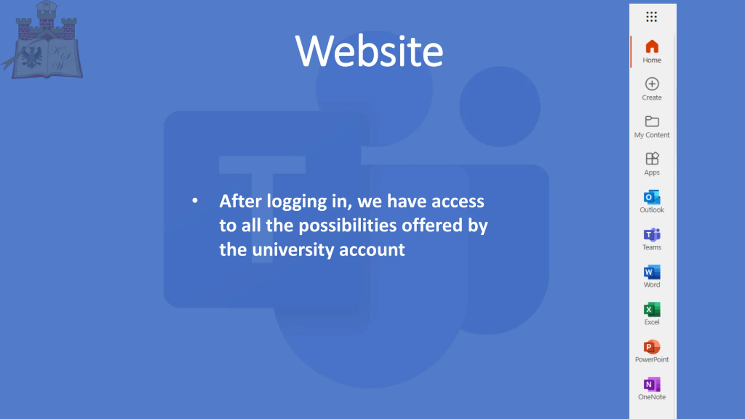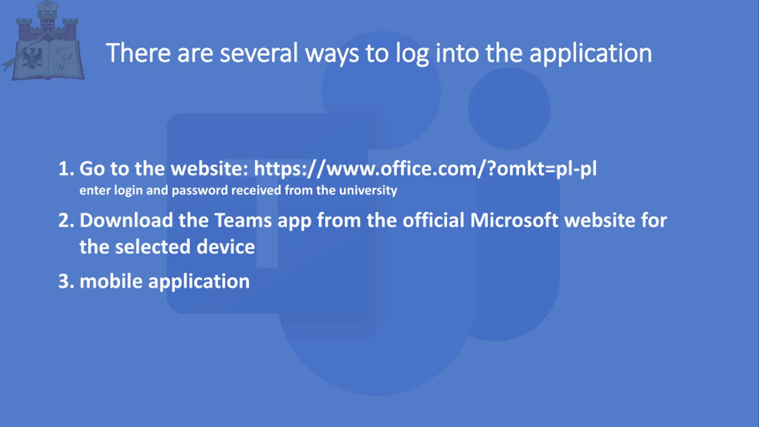 There are several ways to log into the application There are several ways to log into the application 1.Go to the website: https://www.office.com/?omkt=pl-pl enter login and password received from the university 2.Download the Teams app from the official Microsoft website for the selected device 3.mobile application