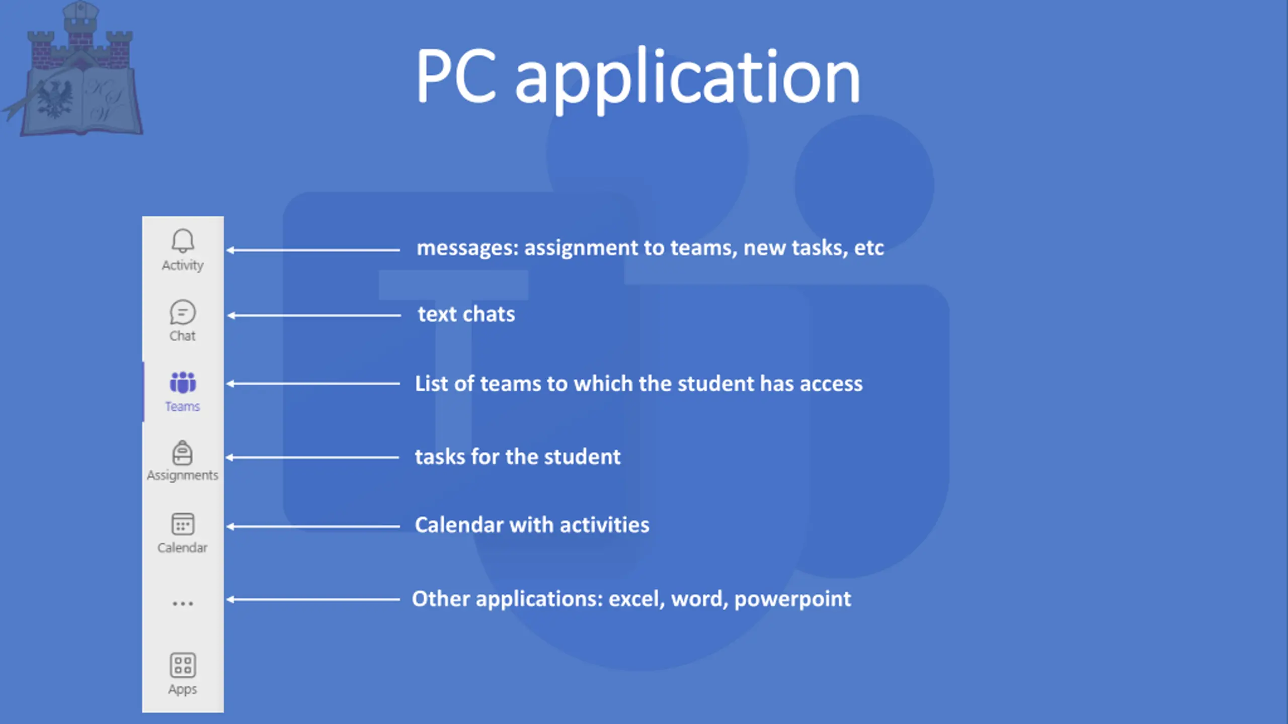 PC PC application application messages: assignment to teams, new tasks, etc text chats List of teams to which the student has access tasks for the student Calendar with activities Other applications: excel, word, powerpoint