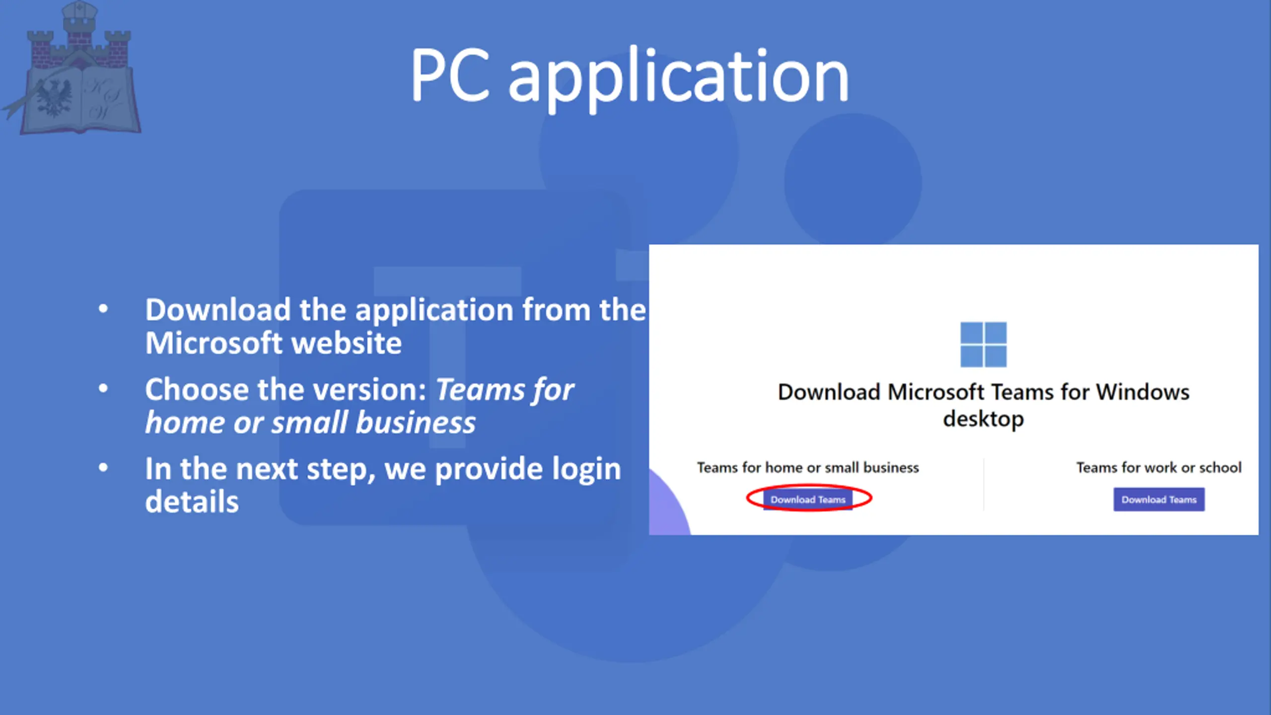 PC PC application application Download the application from the Microsoft website Choose the version: Teams for home or small business In the next step, we provide login details