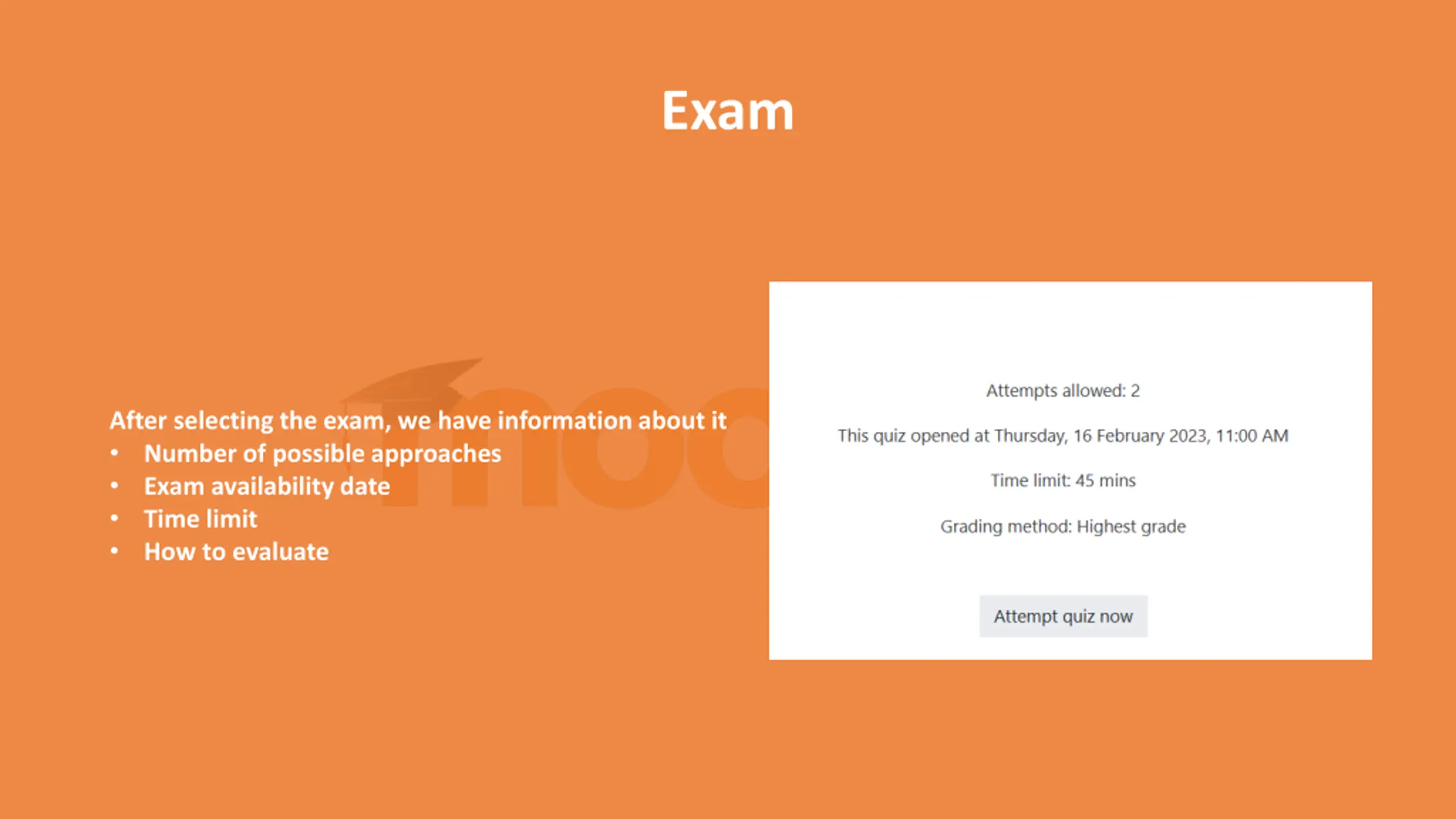 Exam After selecting the exam, we have information about it Number of possible approaches Exam availability date Time limit How to evaluate