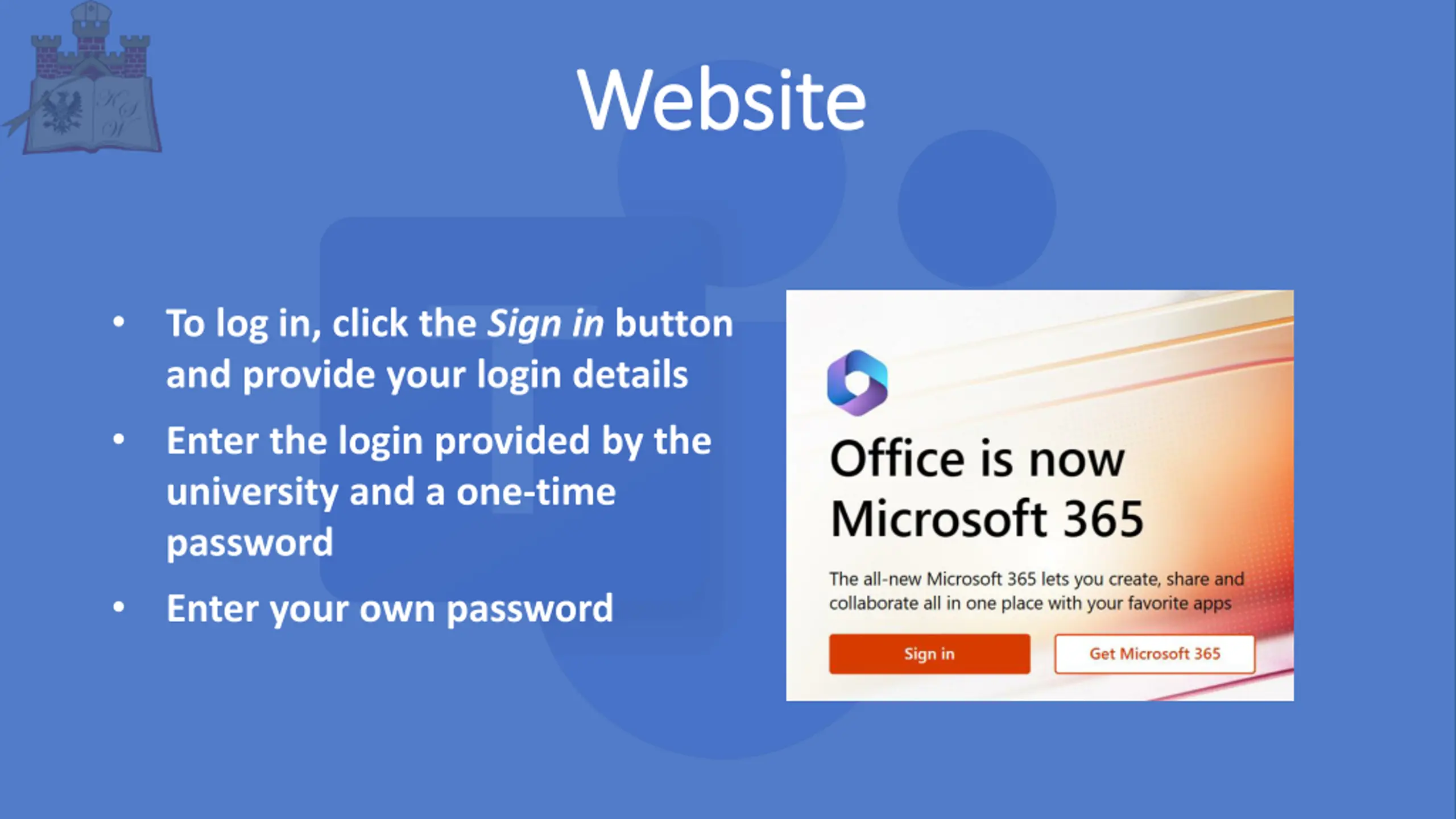 Website Website To log in, click the Sign in button and provide your login details Enter the login provided by the university and a one-time password Enter your own password