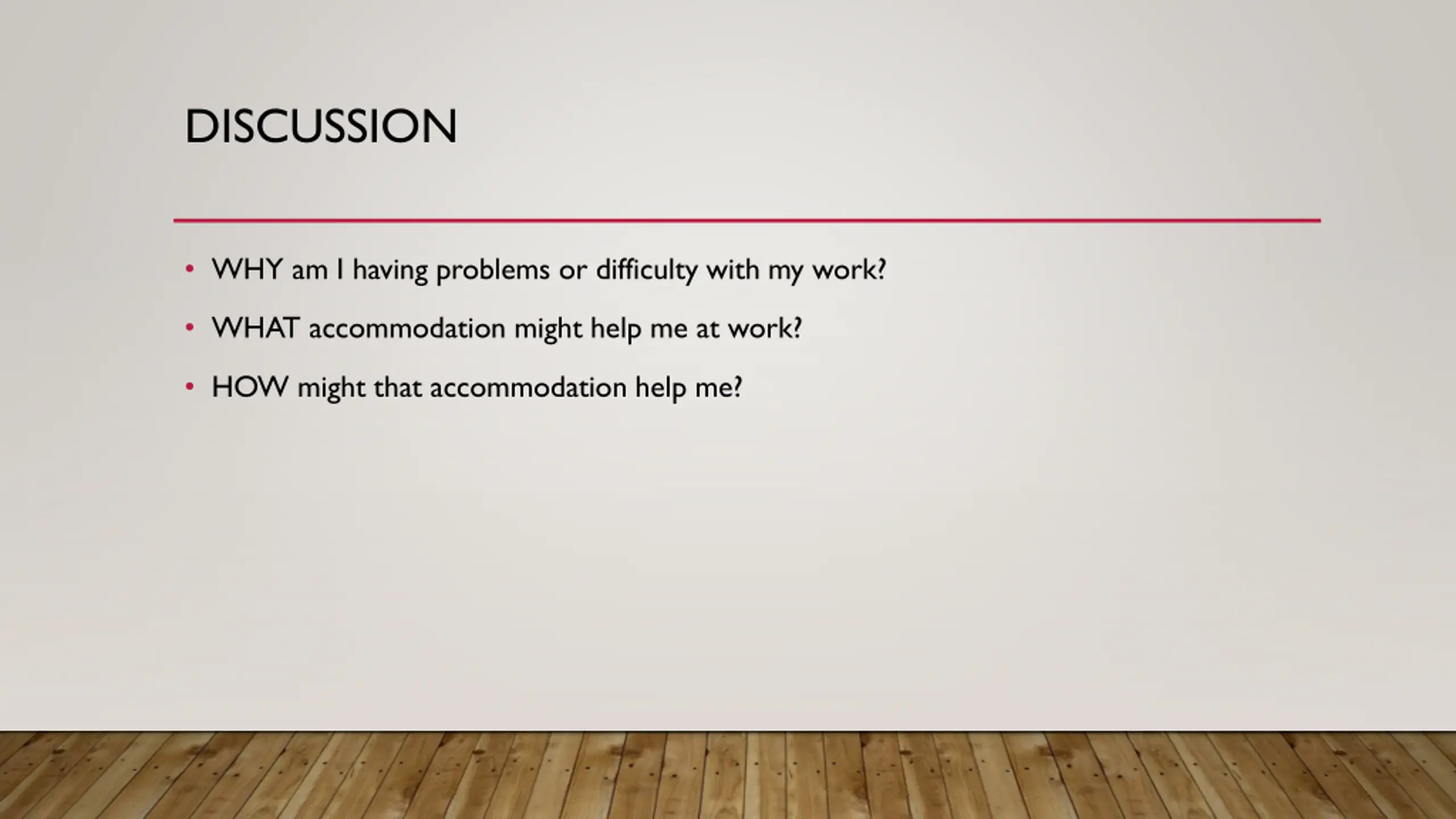 DISCUSSION WHY am I having problems or difficulty with my work? WHAT accommodation might help me at work? HOW might that accommodation help me?
