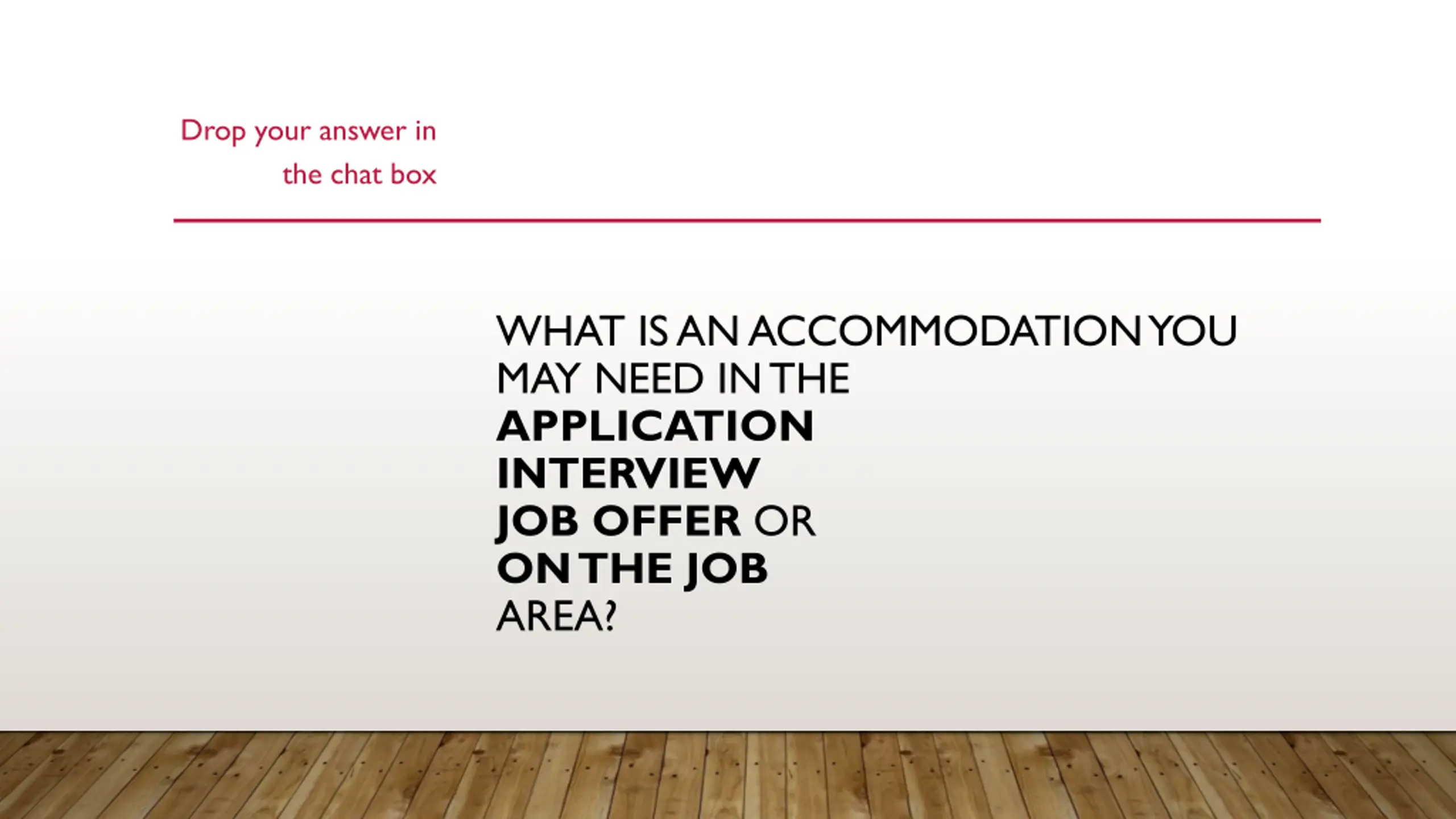 Drop your answer in the chat box WHAT IS AN ACCOMMODATION YOU MAY NEED IN THE APPLICATION INTERVIEW JOB OFFER OR ON THE JOB AREA?