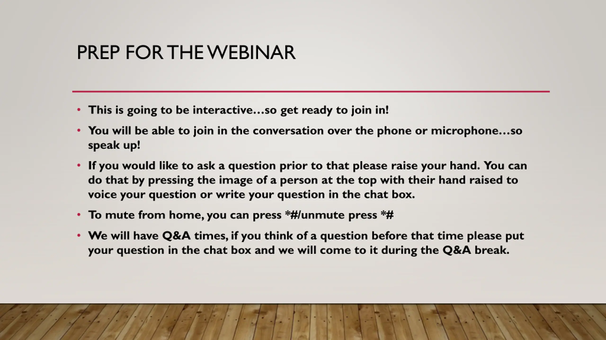 PREP FOR THE WEBINAR This is going to be interactive so get ready to join in! You will be able to join in the conversation over the phone or microphone so speak up! If you would like to ask a question prior to that please raise your hand. You can do that by pressing the image of a person at the top with their hand raised to voice your question or write your question in the chat box. To mute from home, you can press *#/unmute press *# We will have Q&A times, if you think of a question before that time please put your question in the chat box and we will come to it during the Q&A break.