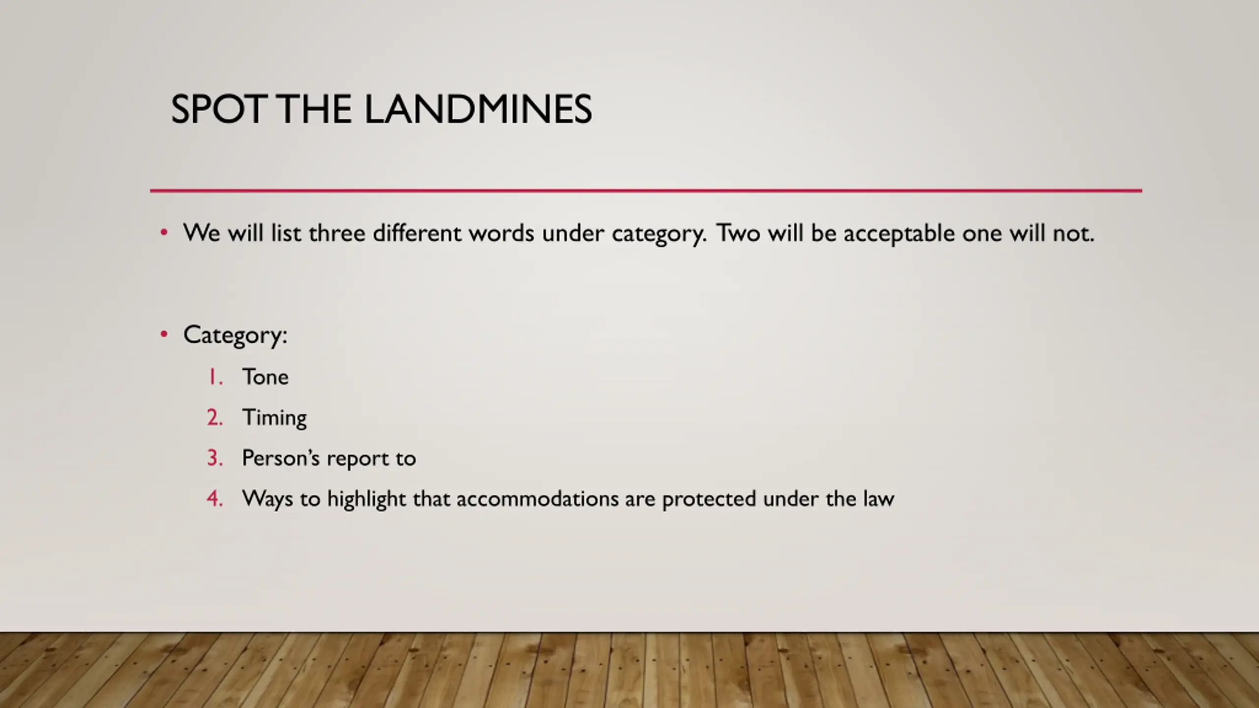 SPOT THE LANDMINES We will list three different words under category. Two will be acceptable one will not. Category: 1. Tone 2. Timing 3. Person s report to 4. Ways to highlight that accommodations are protected under the law
