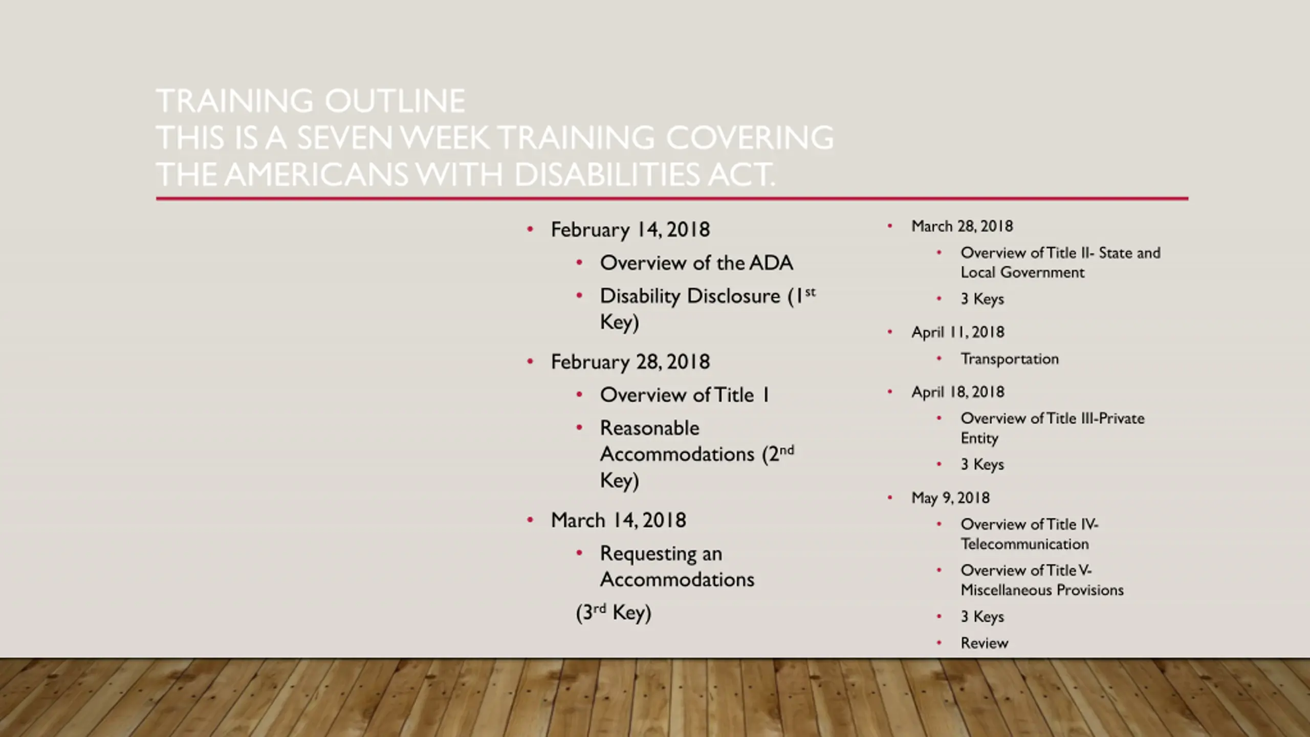 TRAINING OUTLINE THIS IS A SEVEN WEEK TRAINING COVERING THE AMERICANS WITH DISABILITIES ACT. March 28, 2018 Overview of Title II- State and Local Government 3 Keys February 14, 2018 Overview of the ADA Disability Disclosure (1st Key) April 11, 2018 February 28, 2018 Overview of Title 1 Reasonable Accommodations (2nd Key) Transportation April 18, 2018 Overview of Title III-Private Entity 3 Keys May 9, 2018 March 14, 2018 Requesting an Accommodations (3rdKey) Overview of Title IV- Telecommunication Overview of Title V- Miscellaneous Provisions 3 Keys Review