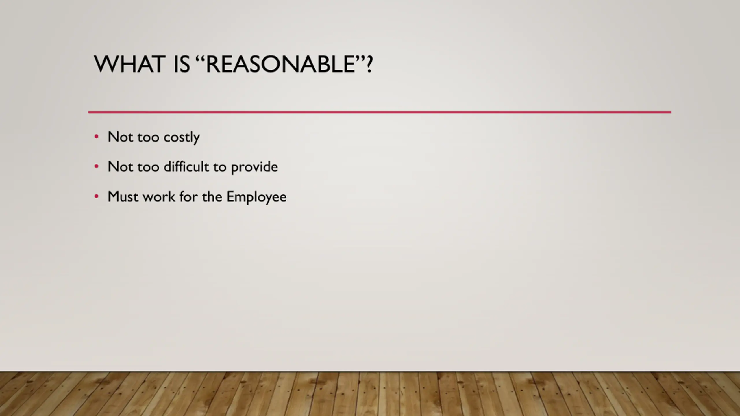 WHAT IS REASONABLE? Not too costly Not too difficult to provide Must work for the Employee
