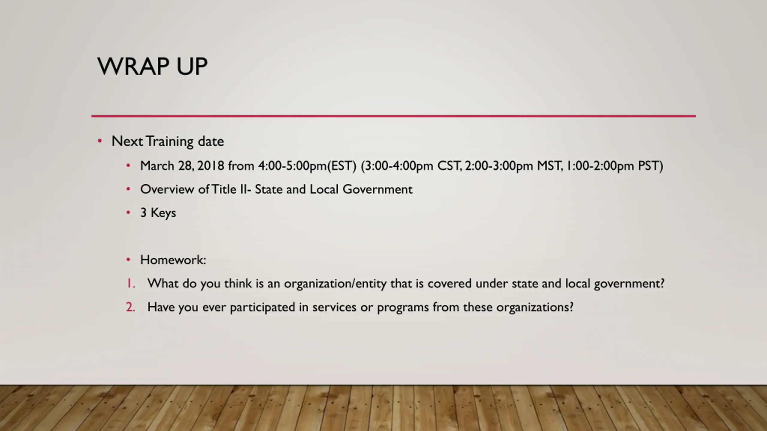 WRAP UP Next Training date March 28, 2018 from 4:00-5:00pm(EST) (3:00-4:00pm CST, 2:00-3:00pm MST, 1:00-2:00pm PST) Overview of Title II- State and Local Government 3 Keys Homework: 1. What do you think is an organization/entity that is covered under state and local government? 2. Have you ever participated in services or programs from these organizations?