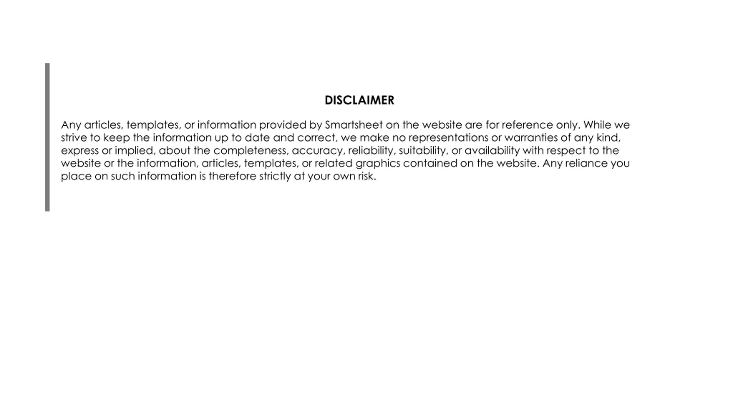 DISCLAIMER Any articles, templates, or information provided by Smartsheet on the website are for reference only. While we strive to keep the information up to date and correct, we make no representations or warranties of any kind, express or implied, about the completeness, accuracy, reliability, suitability, or availability with respect to the website or the information, articles, templates, or related graphics contained on the website. Any reliance you place on such information is therefore strictly at your own risk.