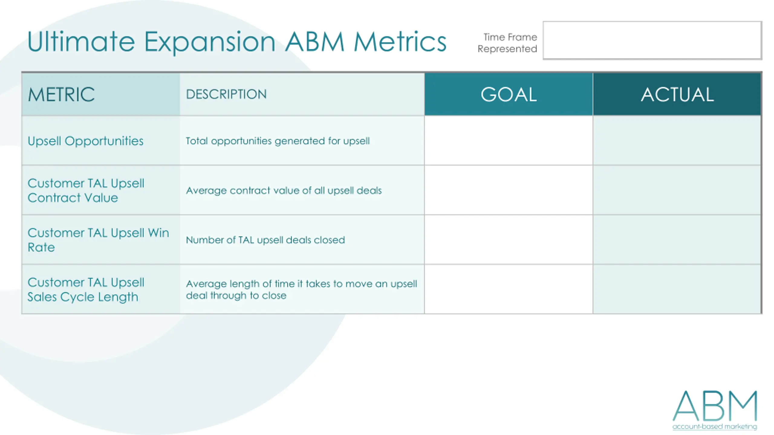 Ultimate Expansion ABM Metrics Time Frame Represented METRIC GOAL ACTUAL DESCRIPTION Upsell Opportunities Total opportunities generated for upsell Customer TAL Upsell Contract Value Average contract value of all upsell deals Customer TAL Upsell Win Rate Number of TAL upsell deals closed Customer TAL Upsell Sales Cycle Length Average length of time it takes to move an upsell deal through to close
