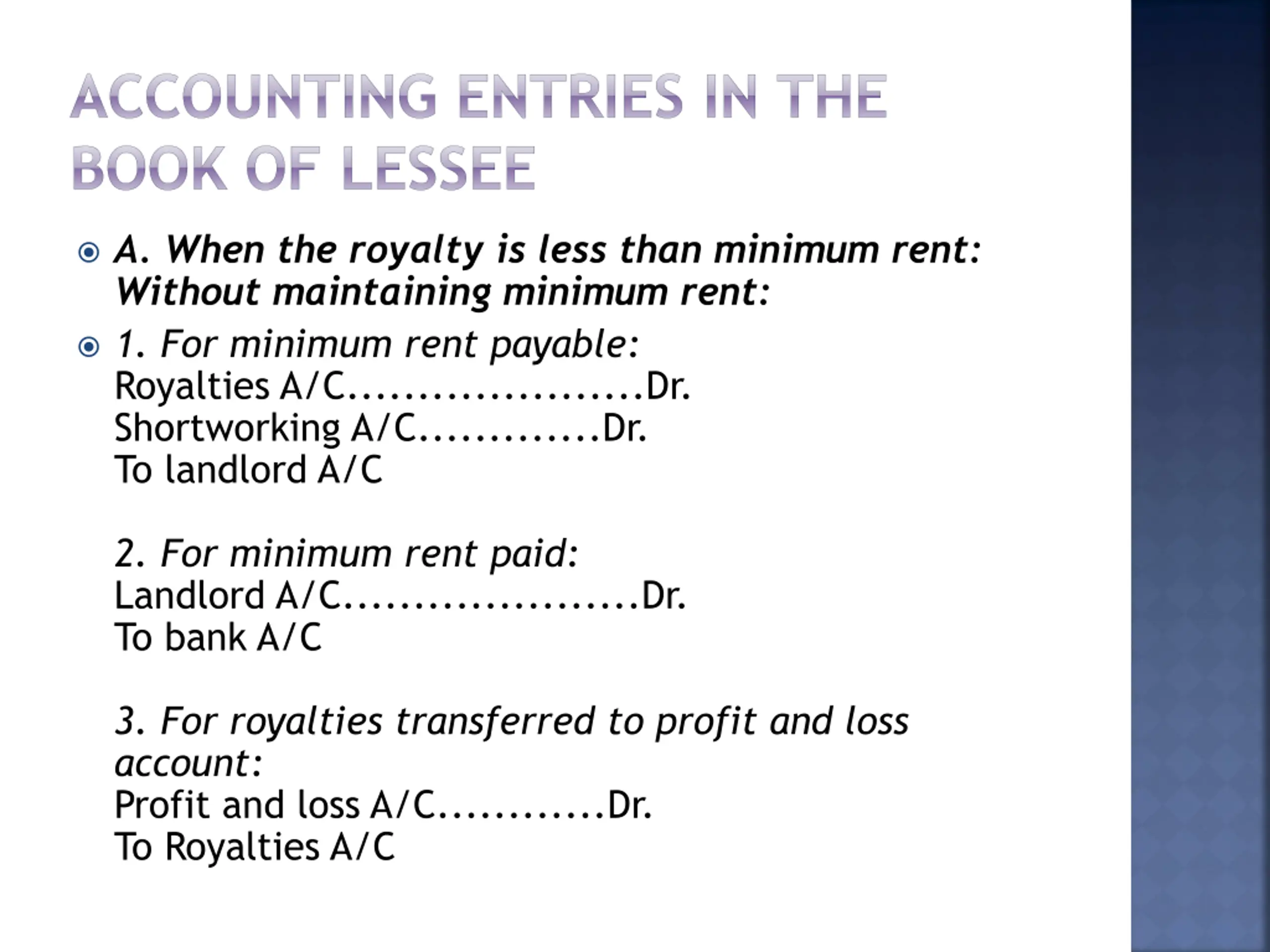 ACCOUNTING ENTRIES IN THE BOOK OF LESSEE A. When the royalty is less than minimum rent: Without maintaining minimum rent: 1. For minimum rent payable: Royalties A/C.....................Dr. Shortworking A/C.............Dr. To landlord A/C 2. For minimum rent paid: Landlord A/C.....................Dr. To bank A/C 3. For royalties transferred to profit and loss account: Profit and loss A/C............Dr. To Royalties A/C