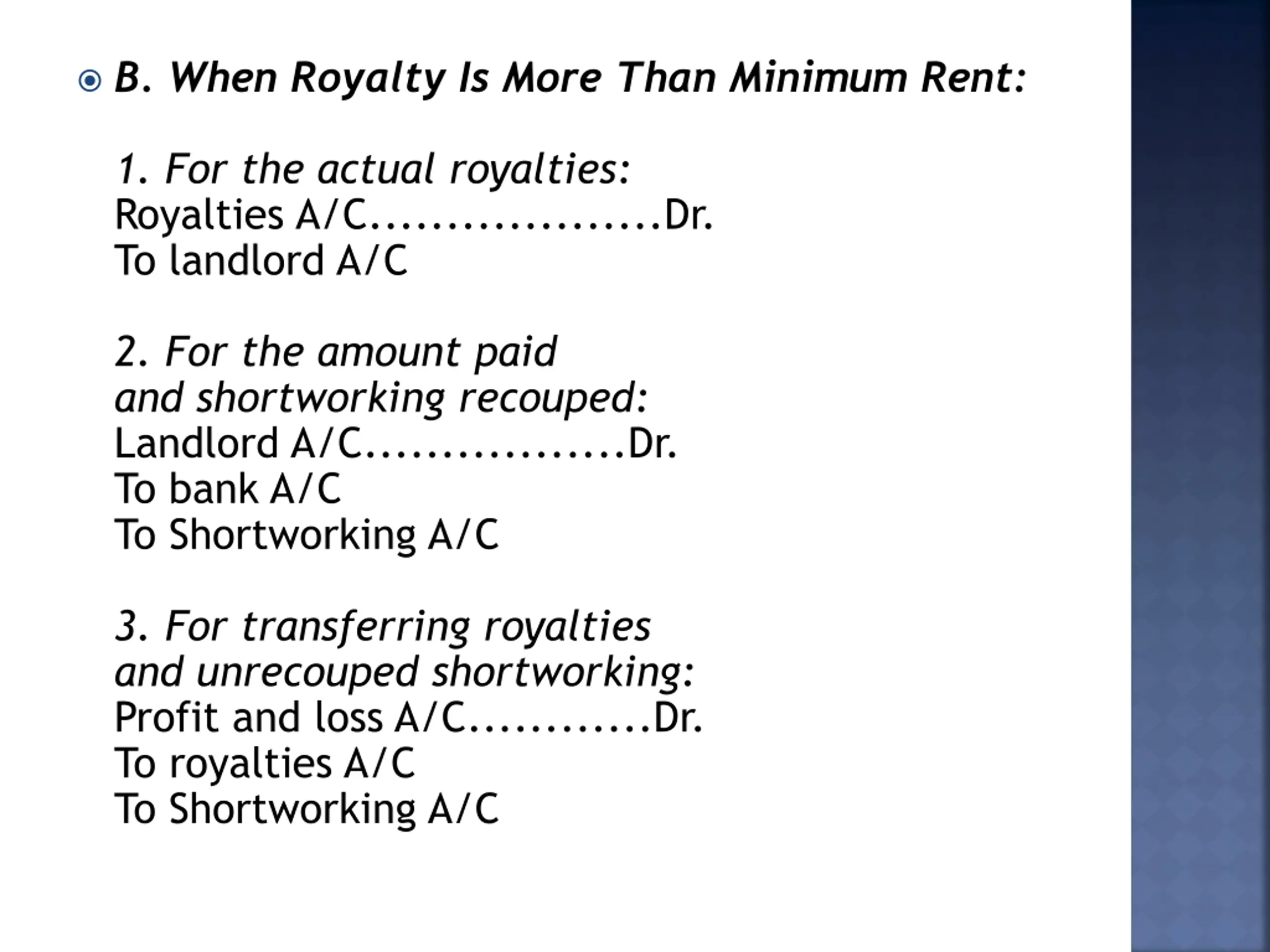 B. When Royalty Is More Than Minimum Rent: 1. For the actual royalties: Royalties A/C...................Dr. To landlord A/C 2. For the amount paid and shortworking recouped: Landlord A/C.................Dr. To bank A/C To Shortworking A/C 3. For transferring royalties and unrecouped shortworking: Profit and loss A/C............Dr. To royalties A/C To Shortworking A/C