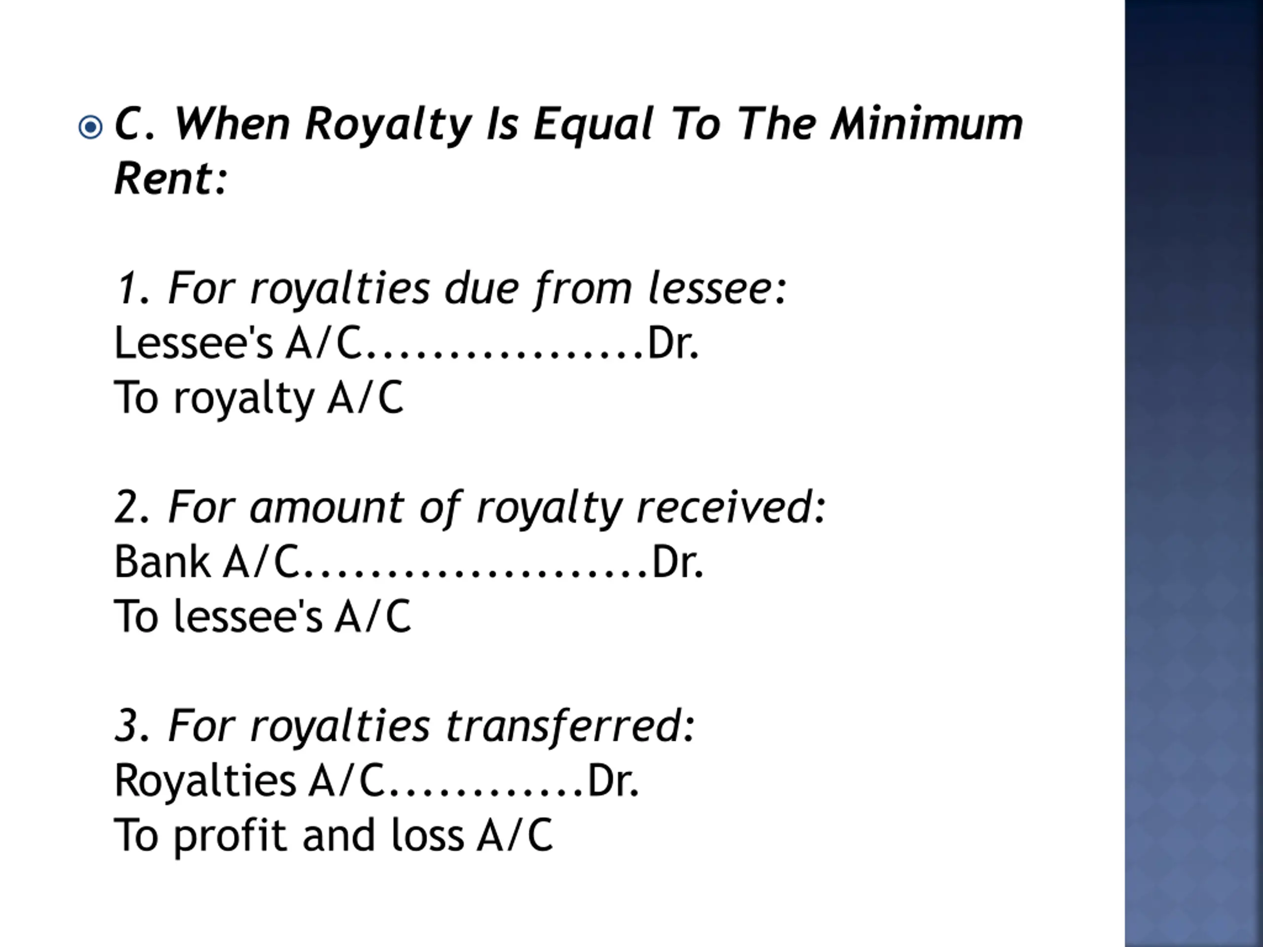 C. When Royalty Is Equal To The Minimum Rent: 1. For royalties due from lessee: Lessee's A/C.................Dr. To royalty A/C 2. For amount of royalty received: Bank A/C.....................Dr. To lessee's A/C 3. For royalties transferred: Royalties A/C............Dr. To profit and loss A/C