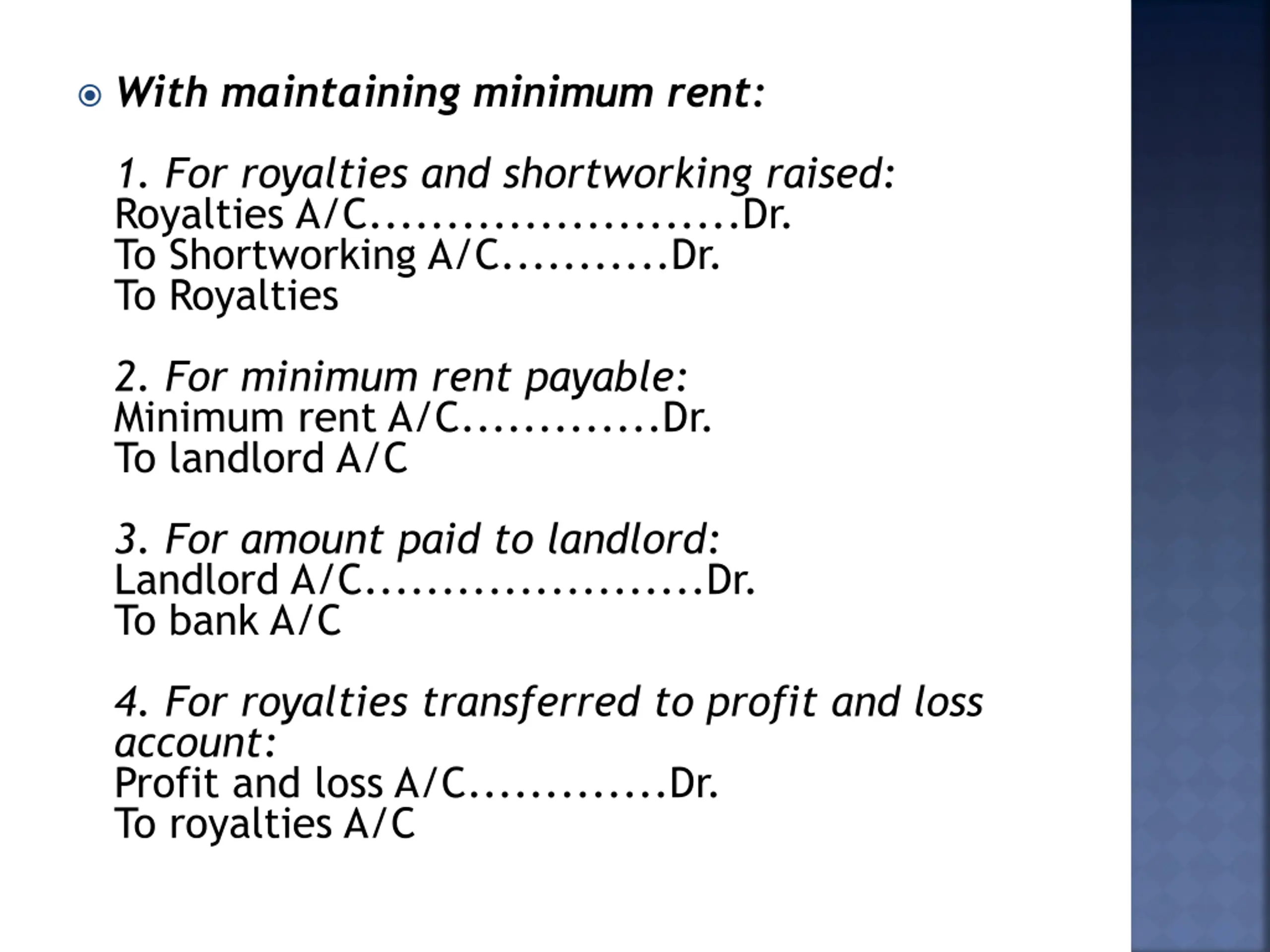 With maintaining minimum rent: 1. For royalties and shortworking raised: Royalties A/C........................Dr. To Shortworking A/C...........Dr. To Royalties 2. For minimum rent payable: Minimum rent A/C.............Dr. To landlord A/C 3. For amount paid to landlord: Landlord A/C......................Dr. To bank A/C 4. For royalties transferred to profit and loss account: Profit and loss A/C.............Dr. To royalties A/C