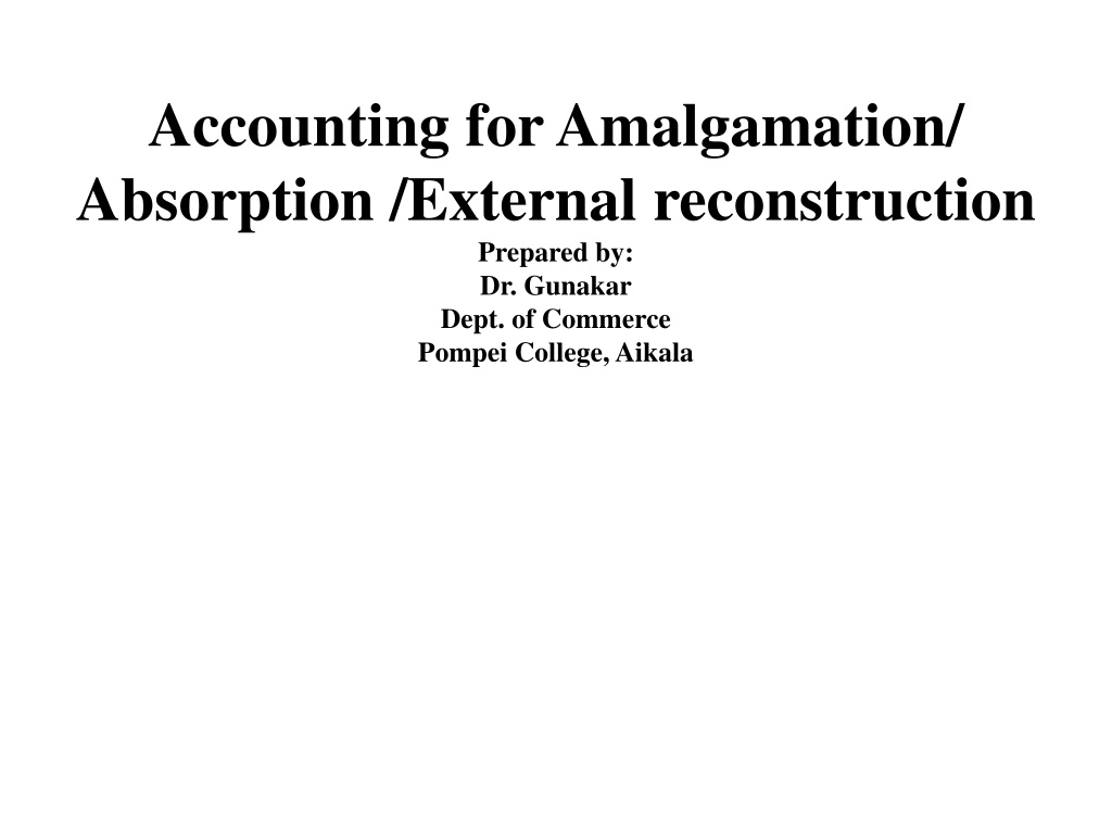Accounting for Amalgamation/ Absorption /External reconstruction Prepared by: Dr. Gunakar Dept. of Commerce Pompei College, Aikala