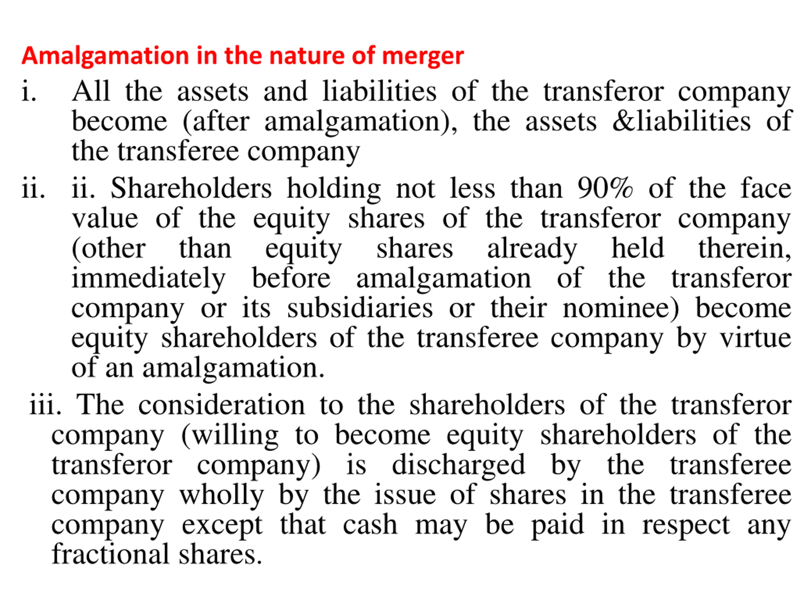 Amalgamation in the nature of merger i. All the assets and liabilities of the transferor company become (after amalgamation), the assets &liabilities of the transferee company ii. ii. Shareholders holding not less than 90% of the face value of the equity shares of the transferor company (other than equity shares immediately before amalgamation of the transferor company or its subsidiaries or their nominee) become equity shareholders of the transferee company by virtue of an amalgamation. iii. The consideration to the shareholders of the transferor company (willing to become equity shareholders of the transferor company) is discharged by the transferee company wholly by the issue of shares in the transferee company except that cash may be paid in respect any fractional shares. already held therein,