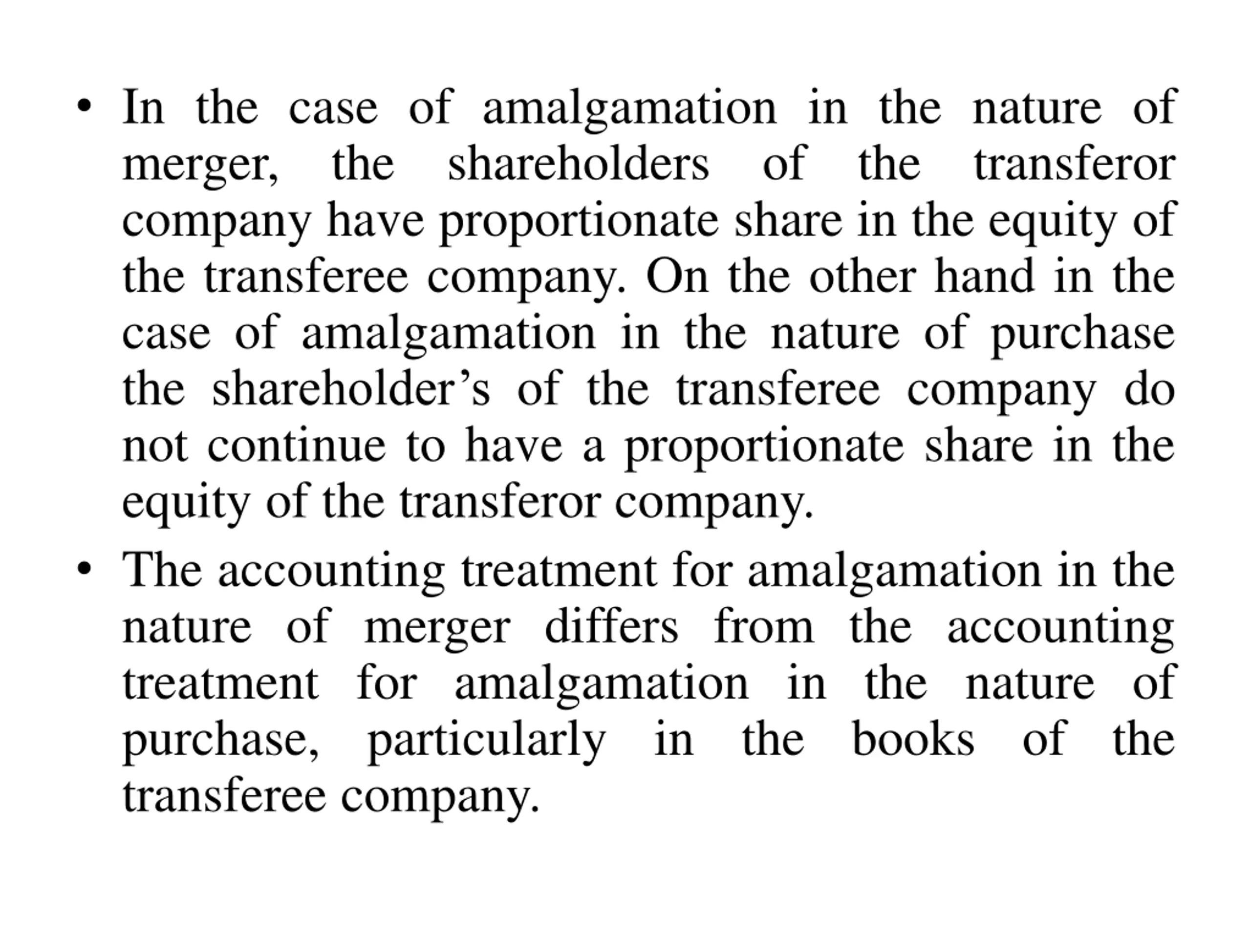 In the case of amalgamation in the nature of merger, the shareholders company have proportionate share in the equity of the transferee company. On the other hand in the case of amalgamation in the nature of purchase the shareholder s of the transferee company do not continue to have a proportionate share in the equity of the transferor company. The accounting treatment for amalgamation in the nature of merger differs from the accounting treatment for amalgamation in the nature of purchase, particularly in the books of the transferee company. of the transferor