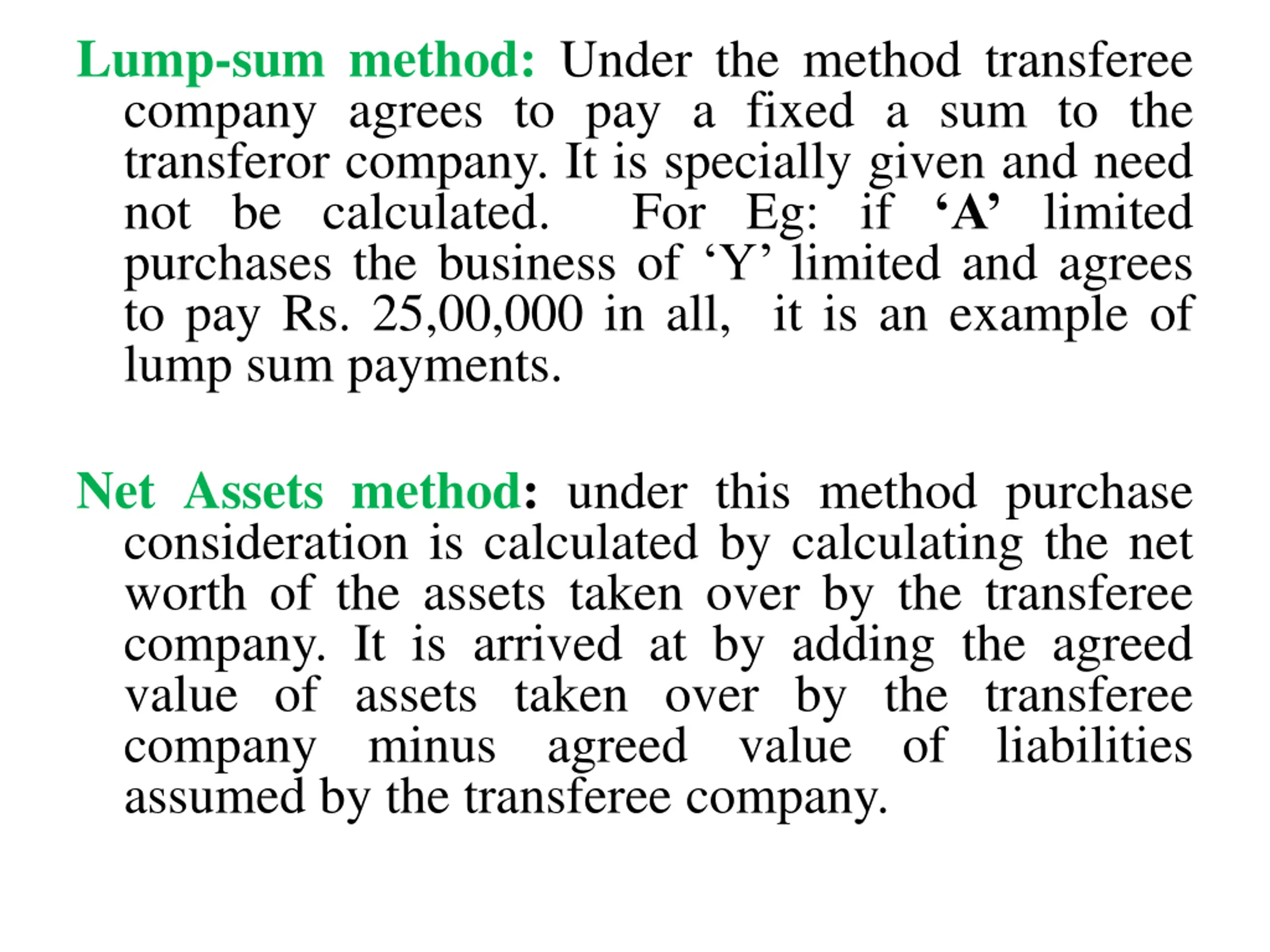Lump-sum method: Under the method transferee company agrees to pay a fixed a sum to the transferor company. It is specially given and need not be calculated. For Eg: if A limited purchases the business of Y limited and agrees to pay Rs. 25,00,000 in all, it is an example of lump sum payments. Net Assets method: under this method purchase consideration is calculated by calculating the net worth of the assets taken over by the transferee company. It is arrived at by adding the agreed value of assets taken over by the transferee company minus agreed assumed by the transferee company. value of liabilities