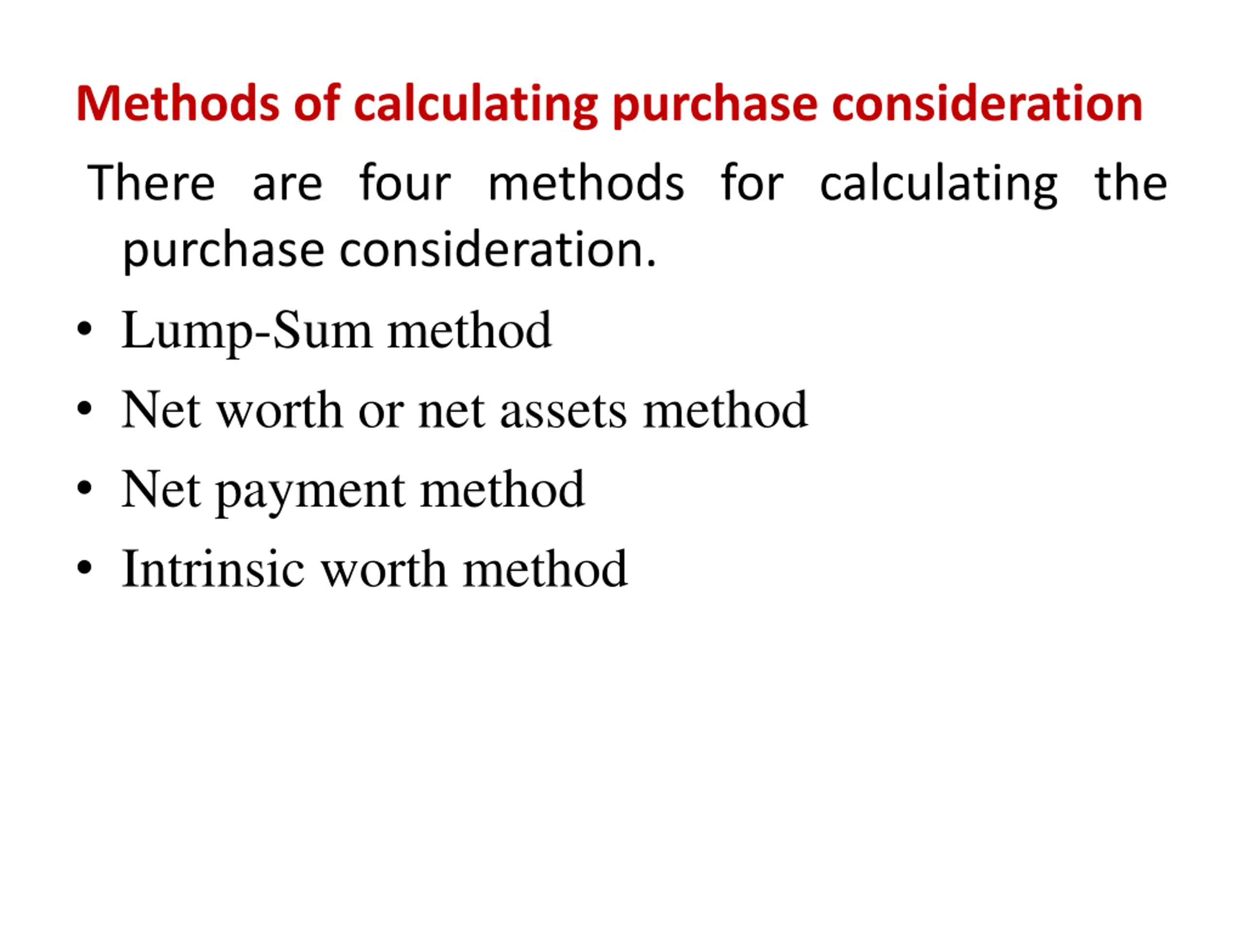 Methods of calculating purchase consideration There are four methods for calculating the purchase consideration. Lump-Sum method Net worth or net assets method Net payment method Intrinsic worth method