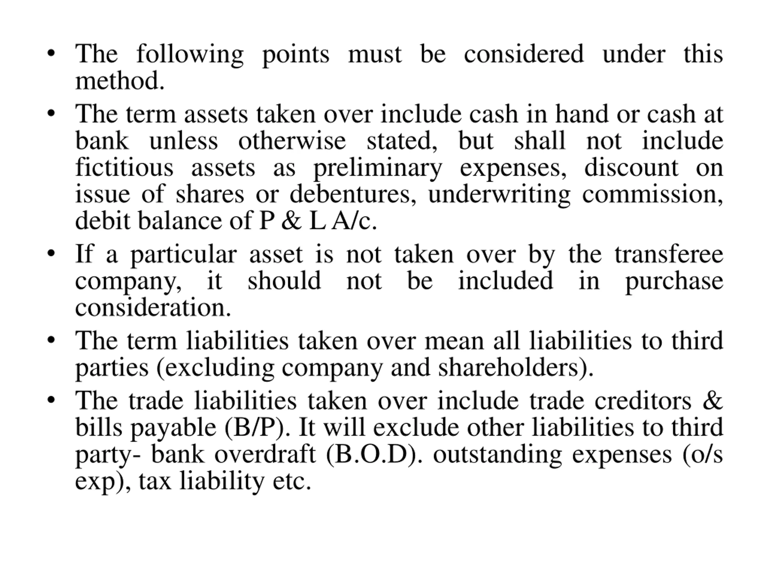 The following points must be considered under this method. The term assets taken over include cash in hand or cash at bank unless otherwise stated, but shall not include fictitious assets as preliminary expenses, discount on issue of shares or debentures, underwriting commission, debit balance of P & LA/c. If a particular asset is not taken over by the transferee company, it should not be included in purchase consideration. The term liabilities taken over mean all liabilities to third parties (excluding company and shareholders). The trade liabilities taken over include trade creditors & bills payable (B/P). It will exclude other liabilities to third party- bank overdraft (B.O.D). outstanding expenses (o/s exp), tax liability etc.