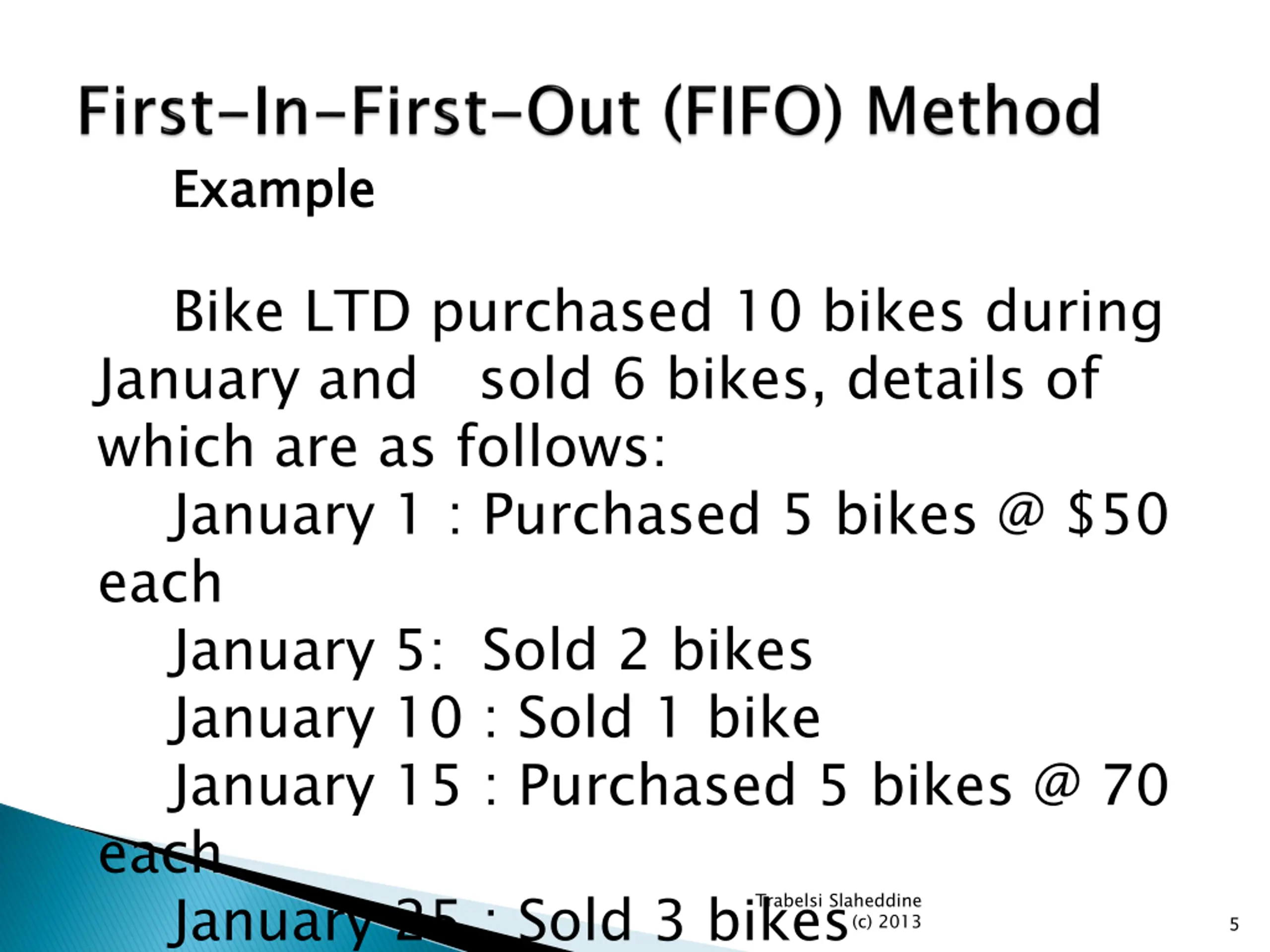 Example Example Bike LTD purchased 10 bikes during January and sold 6 bikes, details of which are as follows: January 1 : Purchased 5 bikes @ $50 each January 5: Sold 2 bikes January 10 : Sold 1 bike January 15 : Purchased 5 bikes @ 70 each January 25 : Sold 3 bikes Trabelsi Slaheddine (c) 2013 5