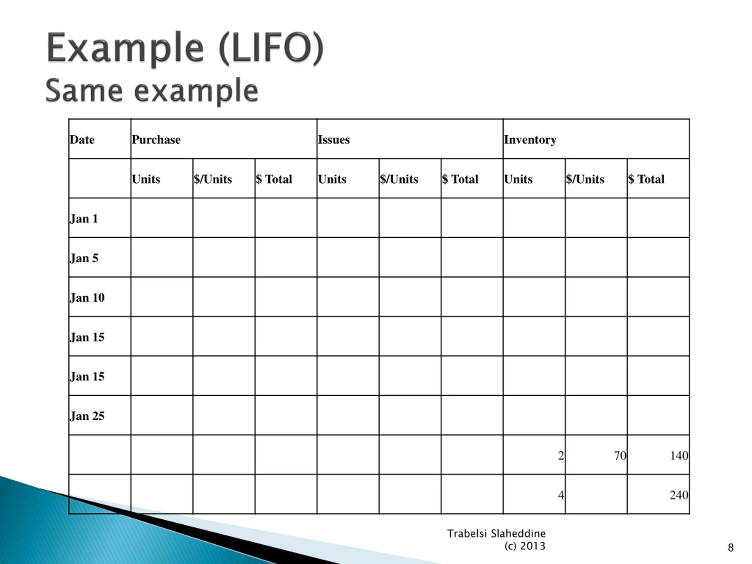 Date Purchase Issues Inventory Units $/Units $ Total Units $/Units $ Total Units $/Units $ Total Jan 1 Jan 5 Jan 10 Jan 15 Jan 15 Jan 25 2 70 140 4 240 Trabelsi Slaheddine (c) 2013 8