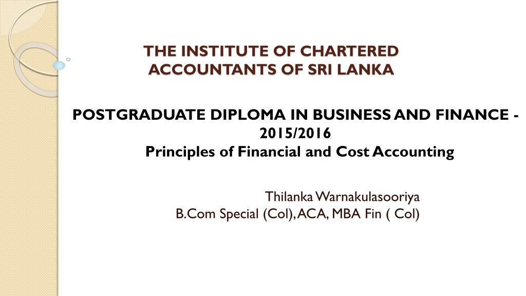 THE INSTITUTE OF CHARTERED ACCOUNTANTS OF SRI LANKA POSTGRADUATE DIPLOMA IN BUSINESS AND FINANCE - 2015/2016 Principles of Financial and Cost Accounting Thilanka Warnakulasooriya B.Com Special (Col), ACA, MBA Fin ( Col)