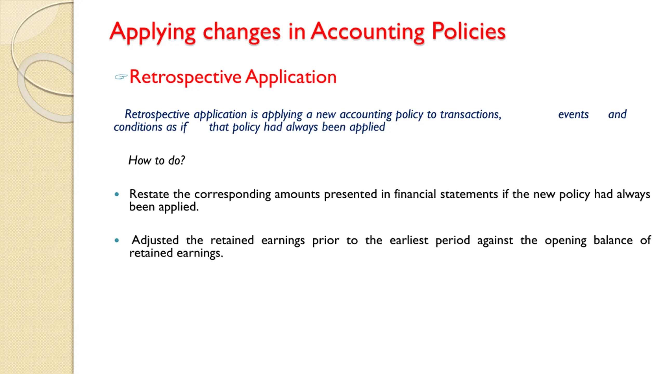 Applying changes in Accounting Policies Retrospective Application Retrospective application is applying a new accounting policy to transactions, conditions as if that policy had always been applied events and How to do? Restate the corresponding amounts presented in financial statements if the new policy had always been applied. Adjusted the retained earnings prior to the earliest period against the opening balance of retained earnings.