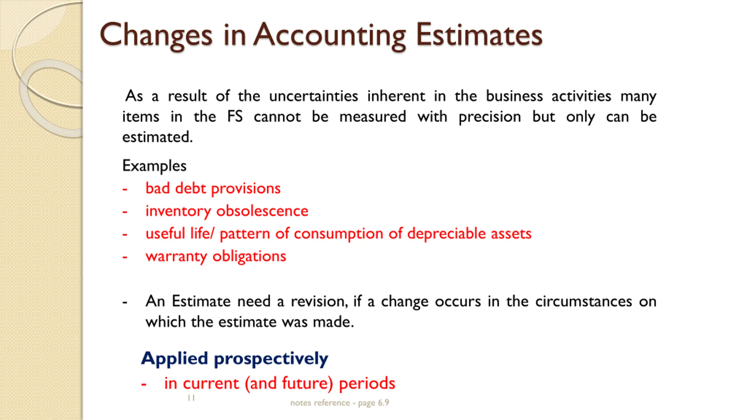Changes in Accounting Estimates As a result of the uncertainties inherent in the business activities many items in the FS cannot be measured with precision but only can be estimated. Examples - bad debt provisions - inventory obsolescence - useful life/ pattern of consumption of depreciable assets - warranty obligations - An Estimate need a revision, if a change occurs in the circumstances on which the estimate was made. Applied prospectively - in current (and future) periods 11 notes reference - page 6.9