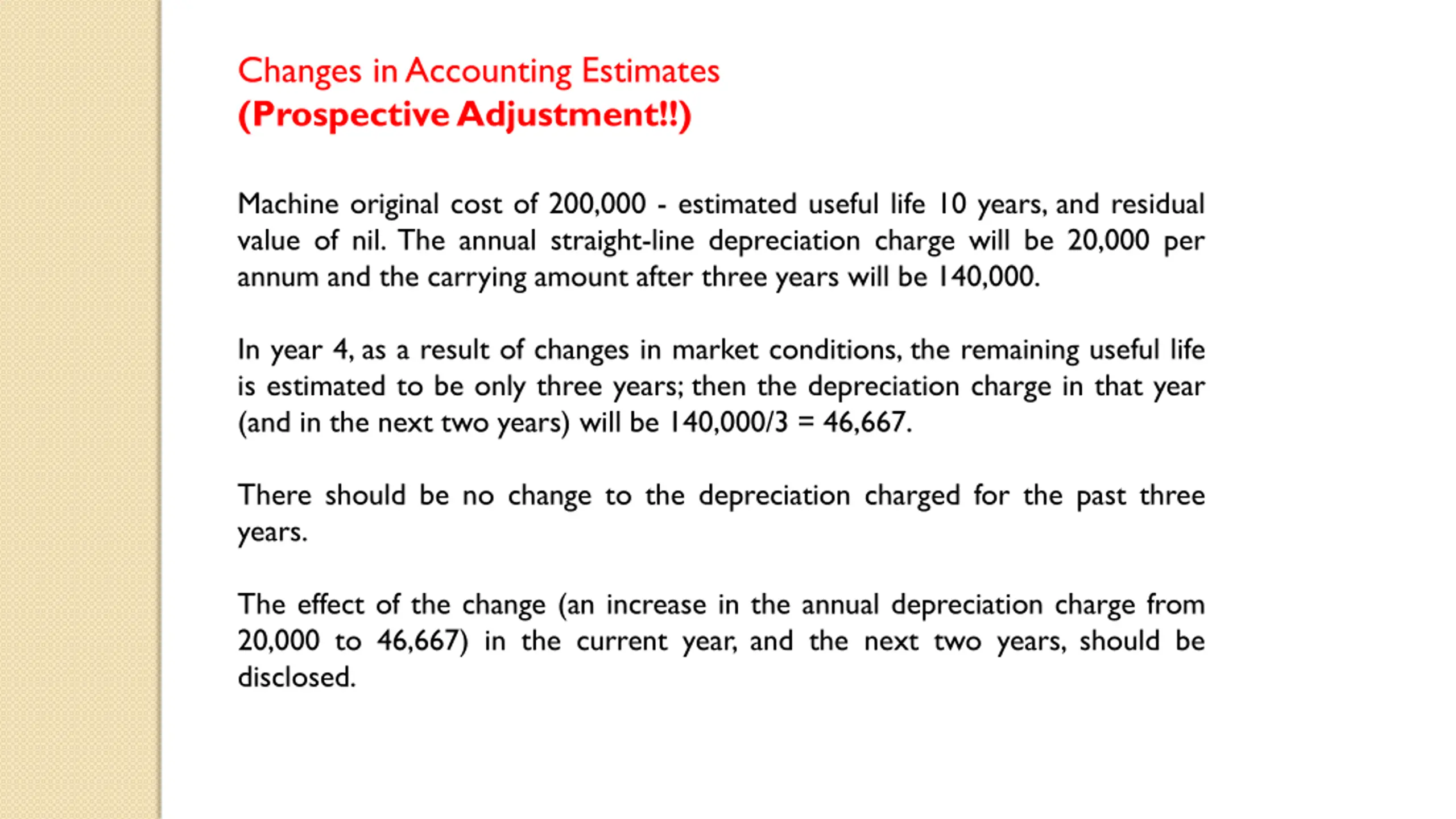 Changes in Accounting Estimates (Prospective Adjustment!!) Machine original cost of 200,000 - estimated useful life 10 years, and residual value of nil. The annual straight-line depreciation charge will be 20,000 per annum and the carrying amount after three years will be 140,000. In year 4, as a result of changes in market conditions, the remaining useful life is estimated to be only three years; then the depreciation charge in that year (and in the next two years) will be 140,000/3 = 46,667. There should be no change to the depreciation charged for the past three years. The effect of the change (an increase in the annual depreciation charge from 20,000 to 46,667) in the current year, and the next two years, should be disclosed.