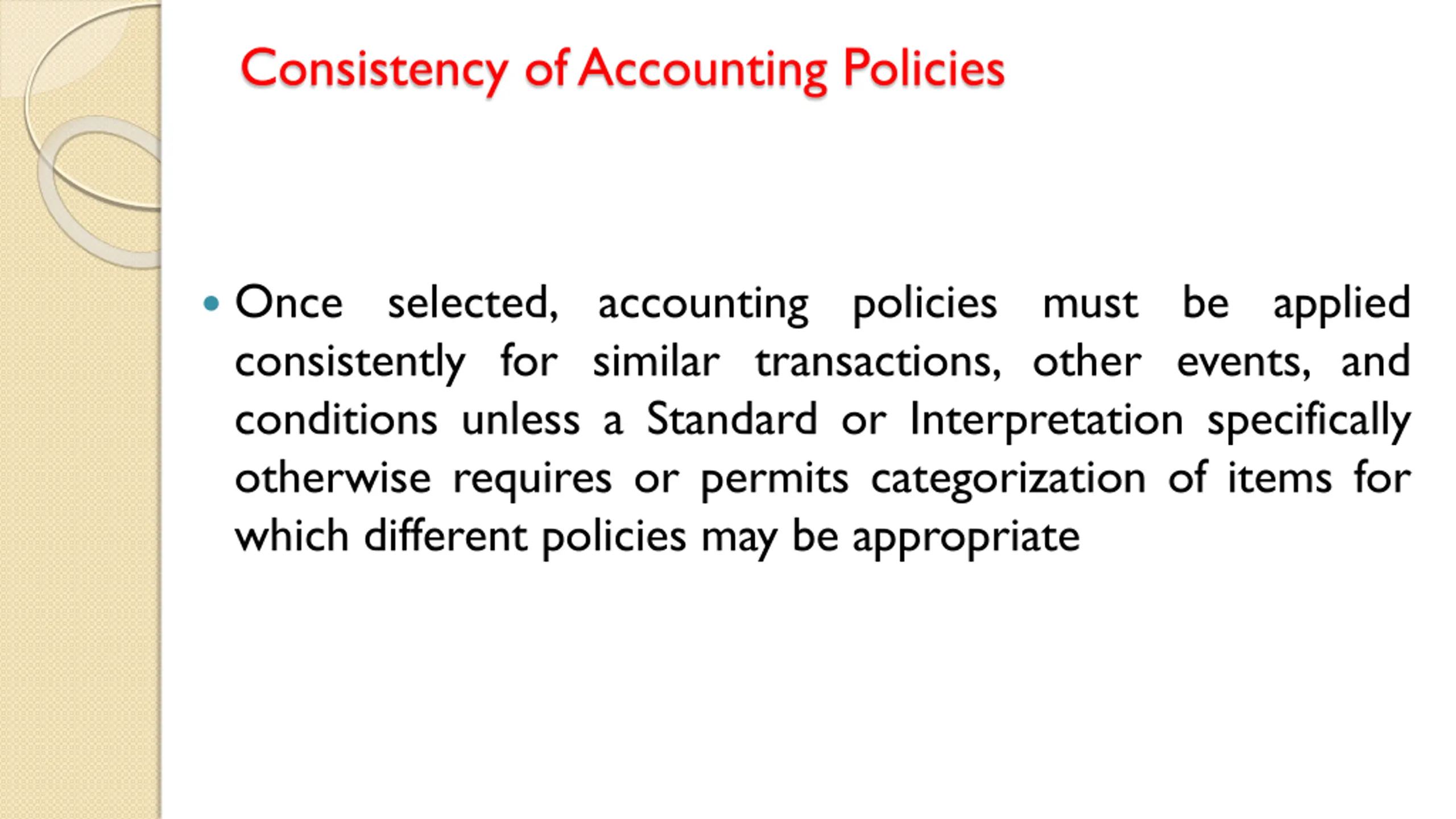 Consistency of Accounting Policies Once selected, accounting policies must be applied consistently for similar transactions, other events, and conditions unless a Standard or Interpretation specifically otherwise requires or permits categorization of items for which different policies may be appropriate
