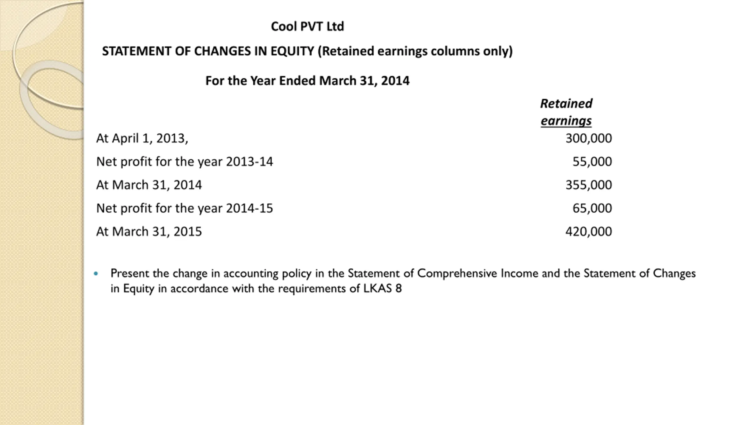 Cool PVT Ltd STATEMENT OF CHANGES IN EQUITY (Retained earnings columns only) For the Year Ended March 31, 2014 Retained earnings 300,000 At April 1, 2013, Net profit for the year 2013-14 55,000 At March 31, 2014 355,000 Net profit for the year 2014-15 65,000 At March 31, 2015 420,000 Present the change in accounting policy in the Statement of Comprehensive Income and the Statement of Changes in Equity in accordance with the requirements of LKAS 8