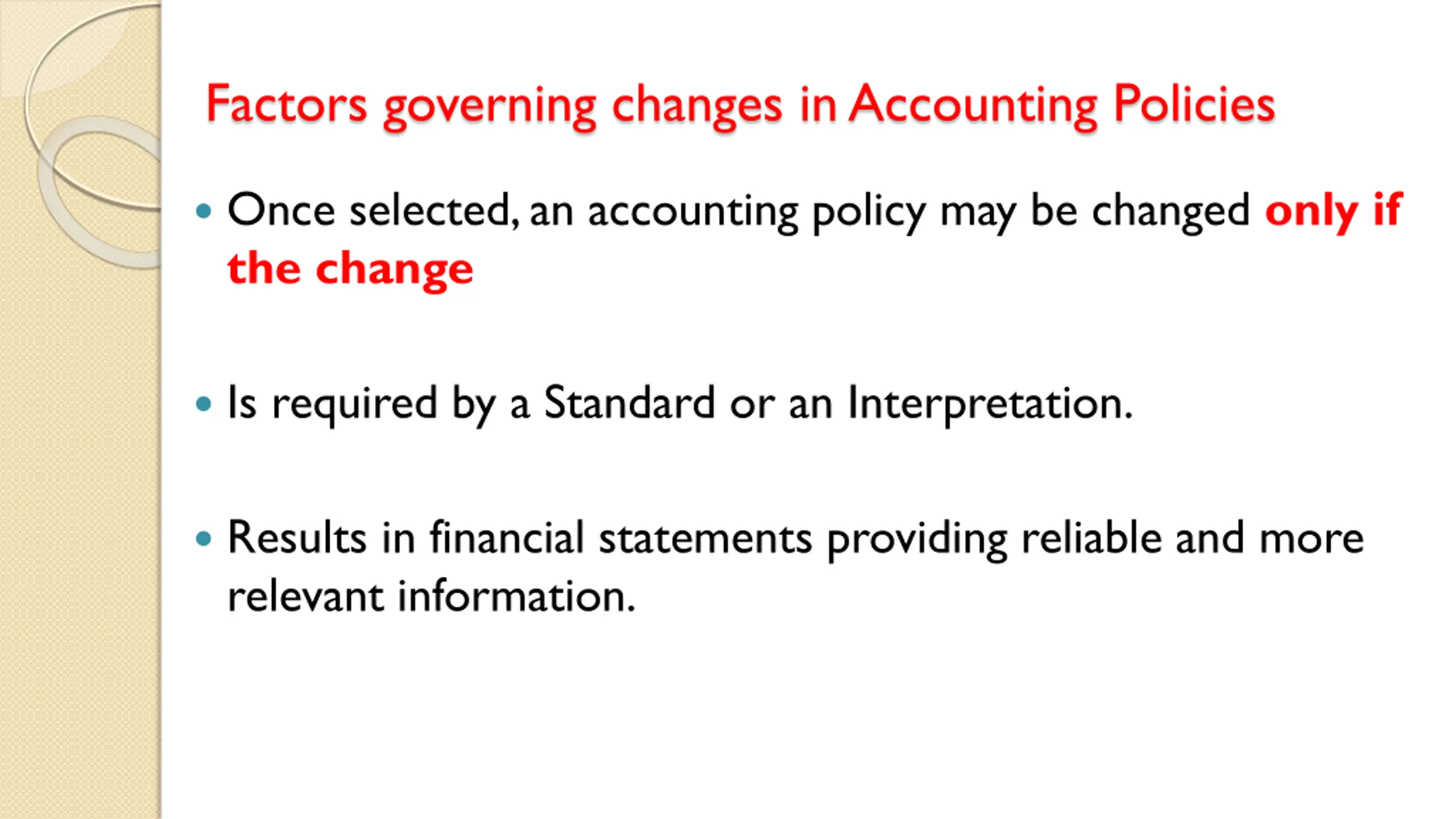Factors governing changes in Accounting Policies Once selected, an accounting policy may be changed only if the change Is required by a Standard or an Interpretation. Results in financial statements providing reliable and more relevant information.