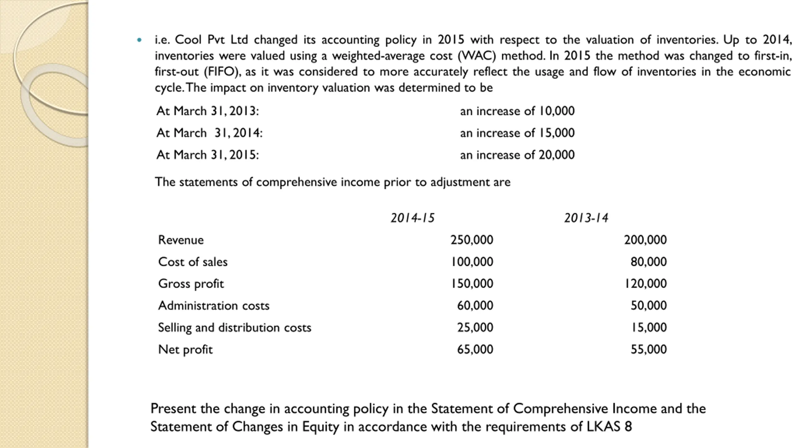 i.e. Cool Pvt Ltd changed its accounting policy in 2015 with respect to the valuation of inventories. Up to 2014, inventories were valued using a weighted-average cost (WAC) method. In 2015 the method was changed to first-in, first-out (FIFO), as it was considered to more accurately reflect the usage and flow of inventories in the economic cycle. The impact on inventory valuation was determined to be At March 31, 2013: At March 31, 2014: At March 31, 2015: an increase of 10,000 an increase of 15,000 an increase of 20,000 The statements of comprehensive income prior to adjustment are 2014-15 2013-14 Revenue Cost of sales Gross profit Administration costs Selling and distribution costs Net profit 250,000 100,000 150,000 60,000 25,000 65,000 200,000 80,000 120,000 50,000 15,000 55,000 Present the change in accounting policy in the Statement of Comprehensive Income and the Statement of Changes in Equity in accordance with the requirements of LKAS 8