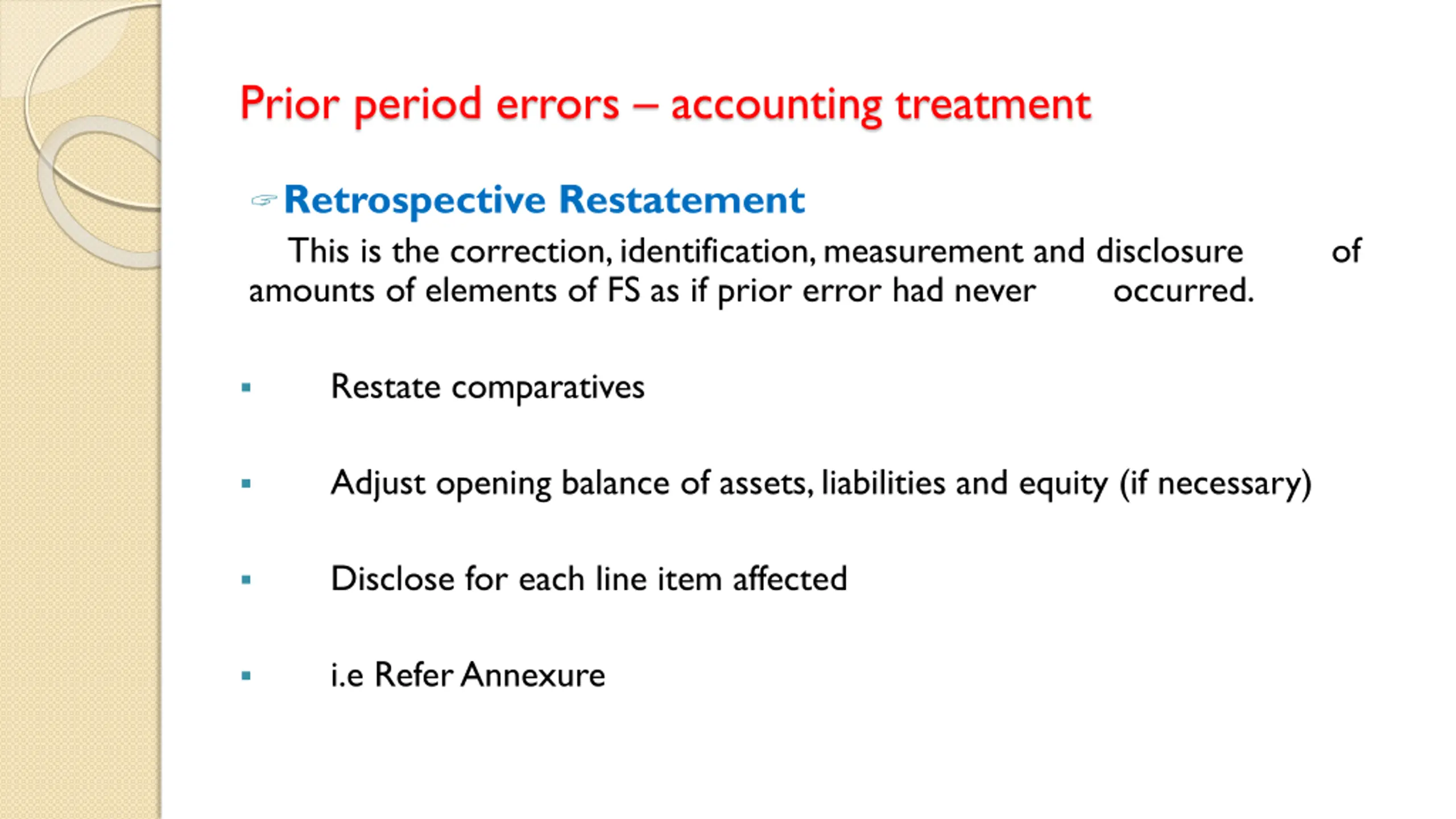 Prior period errors accounting treatment Retrospective Restatement This is the correction, identification, measurement and disclosure amounts of elements of FS as if prior error had never of occurred. Restate comparatives Adjust opening balance of assets, liabilities and equity (if necessary) Disclose for each line item affected i.e Refer Annexure