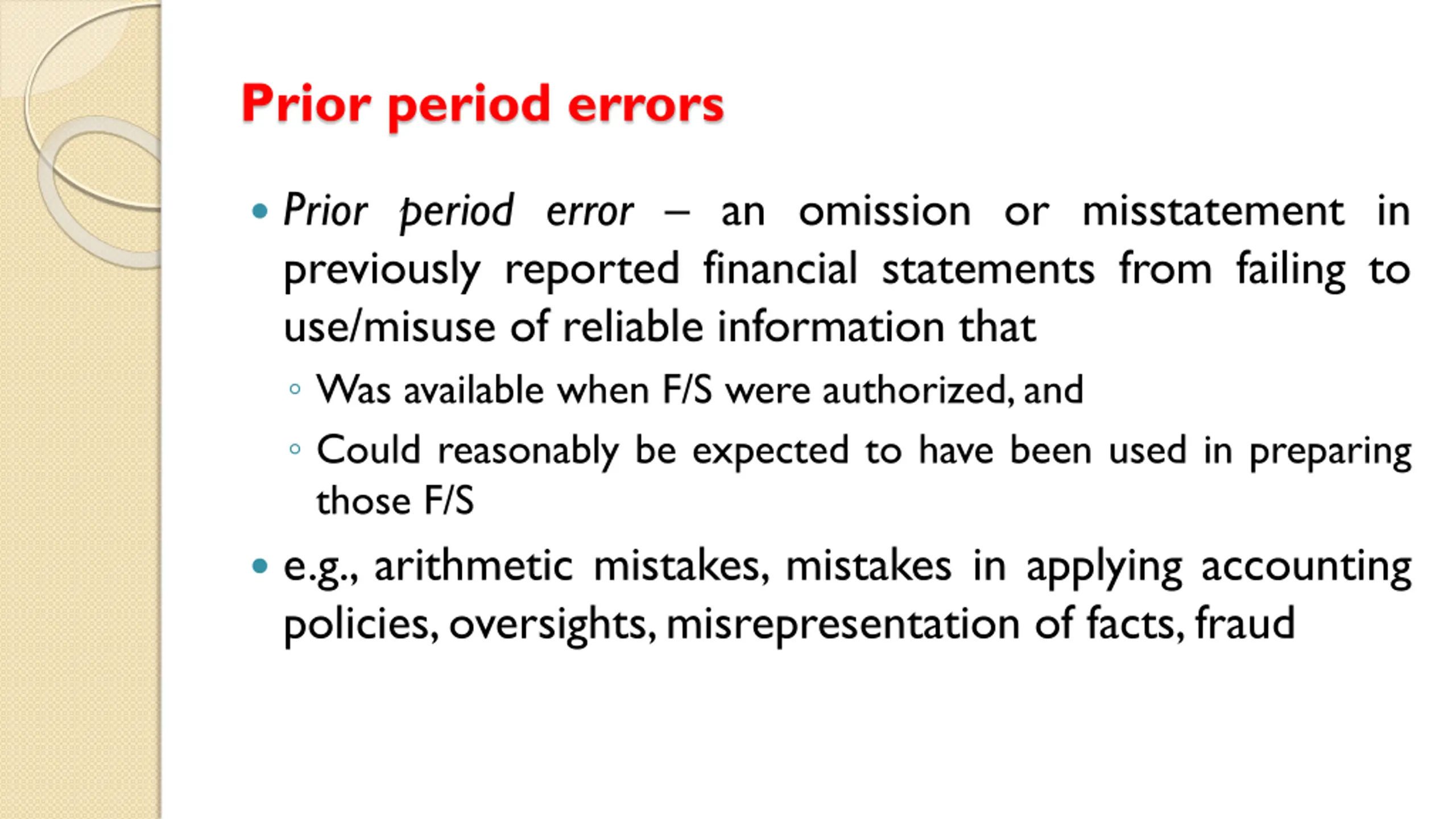Prior period errors Prior period error an omission or misstatement in previously reported financial statements from failing to use/misuse of reliable information that Was available when F/S were authorized, and Could reasonably be expected to have been used in preparing those F/S e.g., arithmetic mistakes, mistakes in applying accounting policies, oversights, misrepresentation of facts, fraud