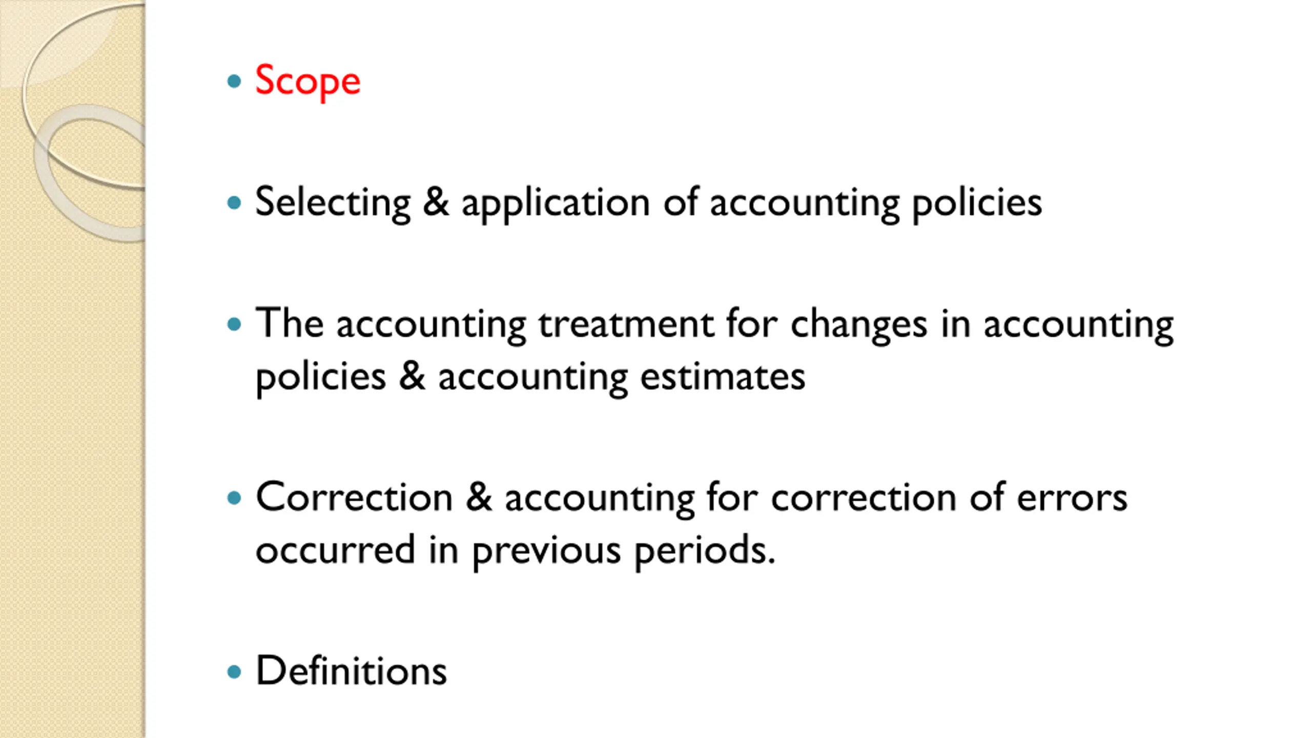 Scope Selecting & application of accounting policies The accounting treatment for changes in accounting policies & accounting estimates Correction & accounting for correction of errors occurred in previous periods. Definitions