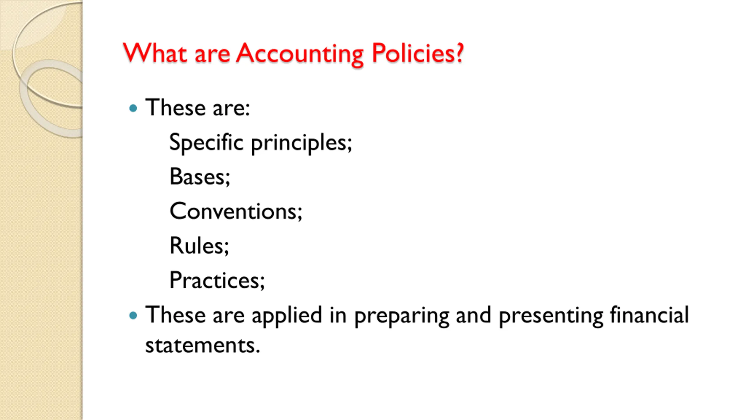 What are Accounting Policies? These are: Specific principles; Bases; Conventions; Rules; Practices; These are applied in preparing and presenting financial statements.