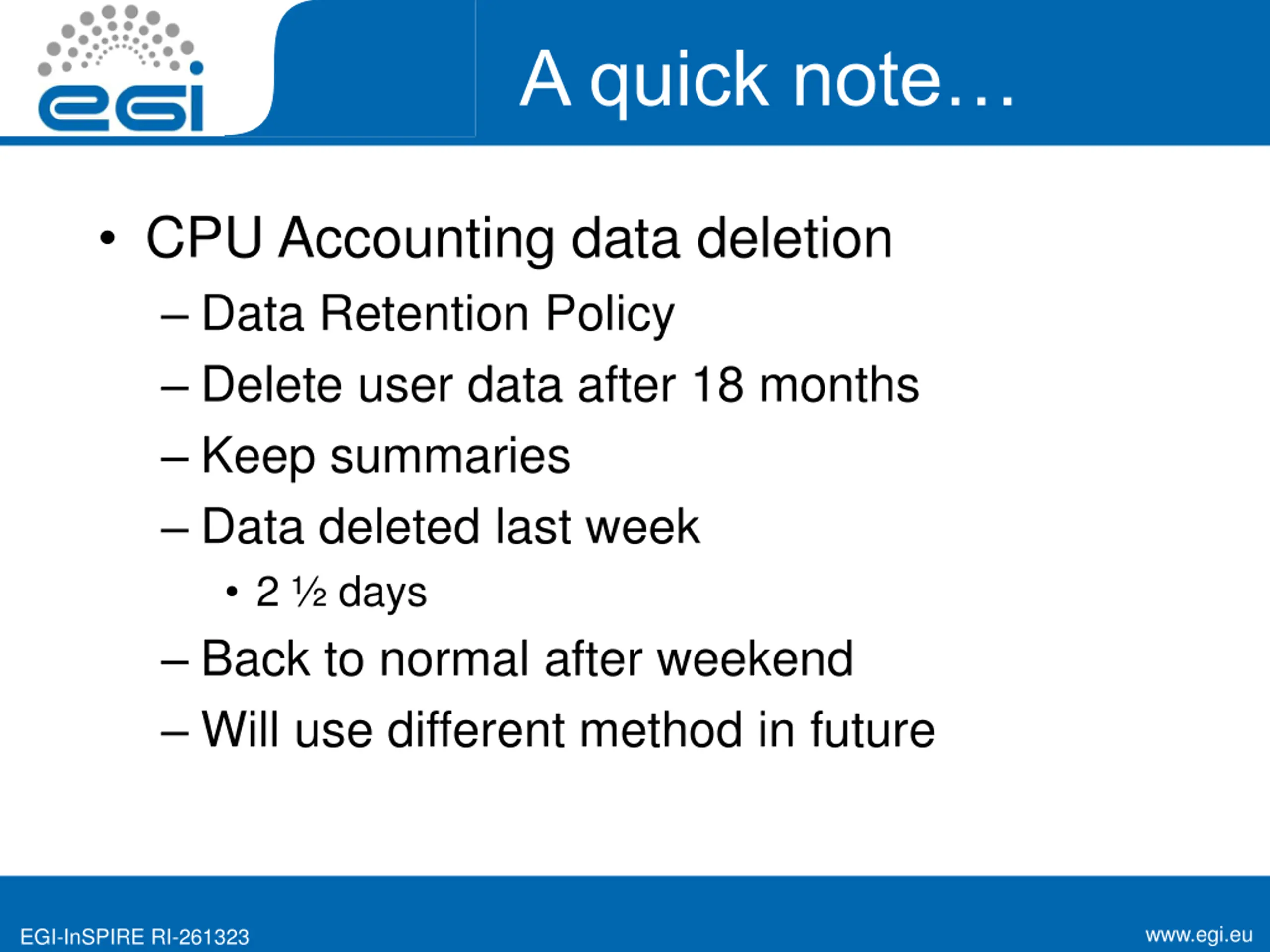 A quick note CPU Accounting data deletion Data Retention Policy Delete user data after 18 months Keep summaries Data deleted last week 2 days Back to normal after weekend Will use different method in future www.egi.eu EGI-InSPIRE RI-261323
