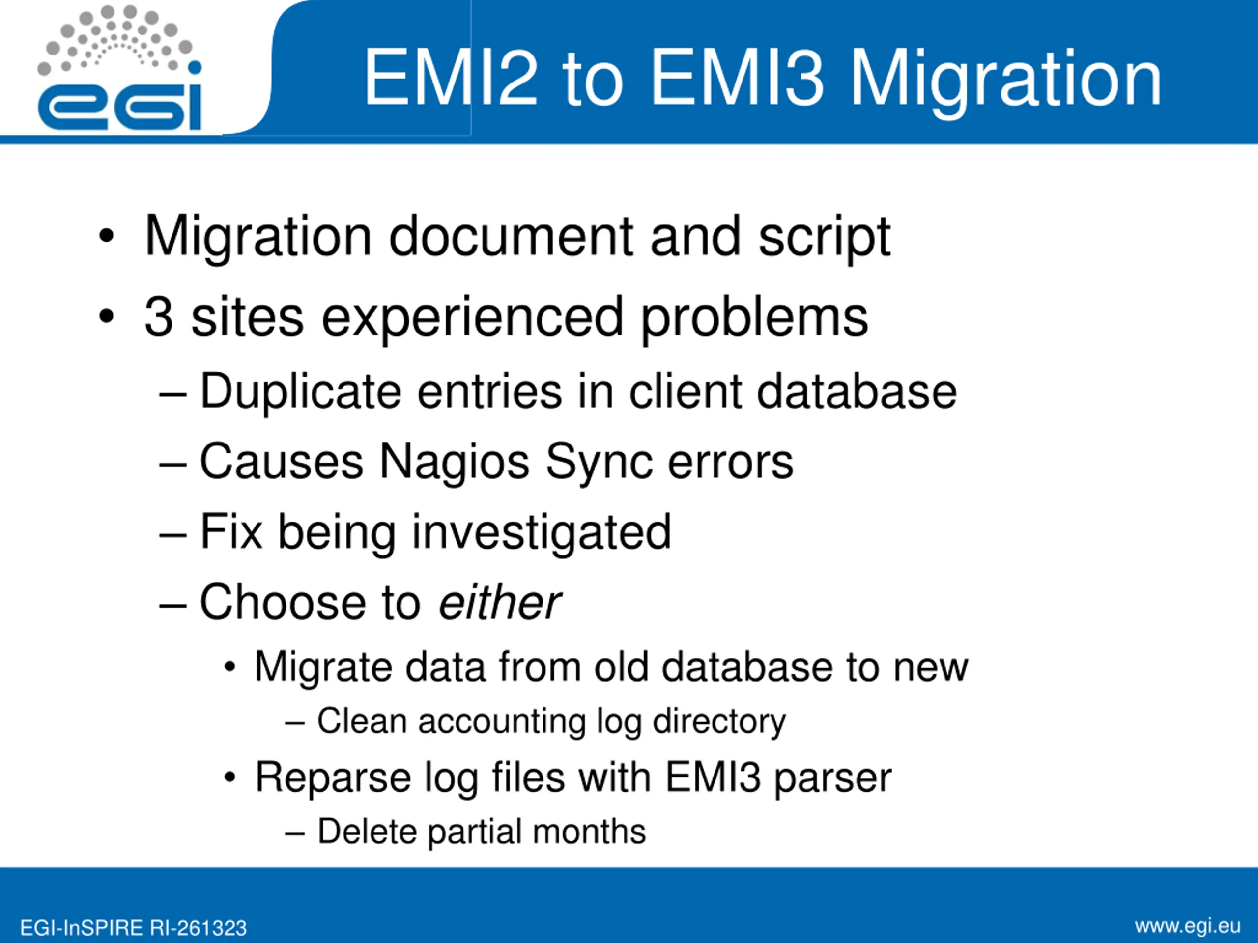 EMI2 to EMI3 Migration Migration document and script 3 sites experienced problems Duplicate entries in client database Causes Nagios Sync errors Fix being investigated Choose to either Migrate data from old database to new Clean accounting log directory Reparse log files with EMI3 parser Delete partial months www.egi.eu EGI-InSPIRE RI-261323