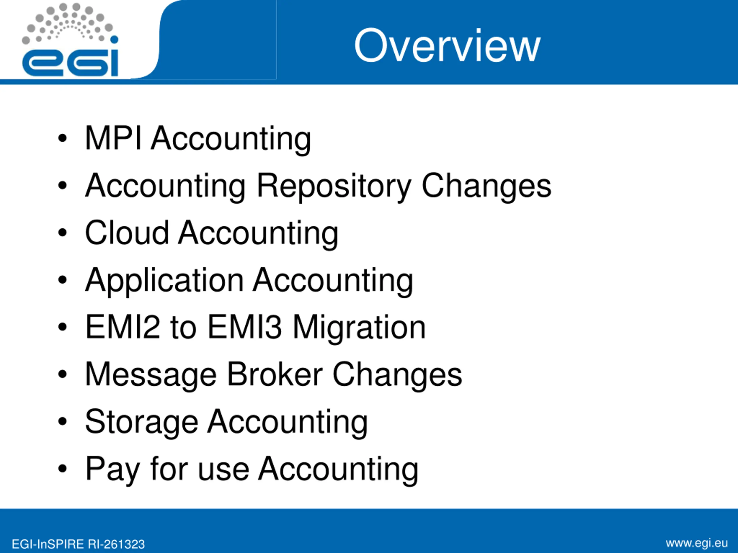 Overview MPI Accounting Accounting Repository Changes Cloud Accounting Application Accounting EMI2 to EMI3 Migration Message Broker Changes Storage Accounting Pay for use Accounting www.egi.eu EGI-InSPIRE RI-261323
