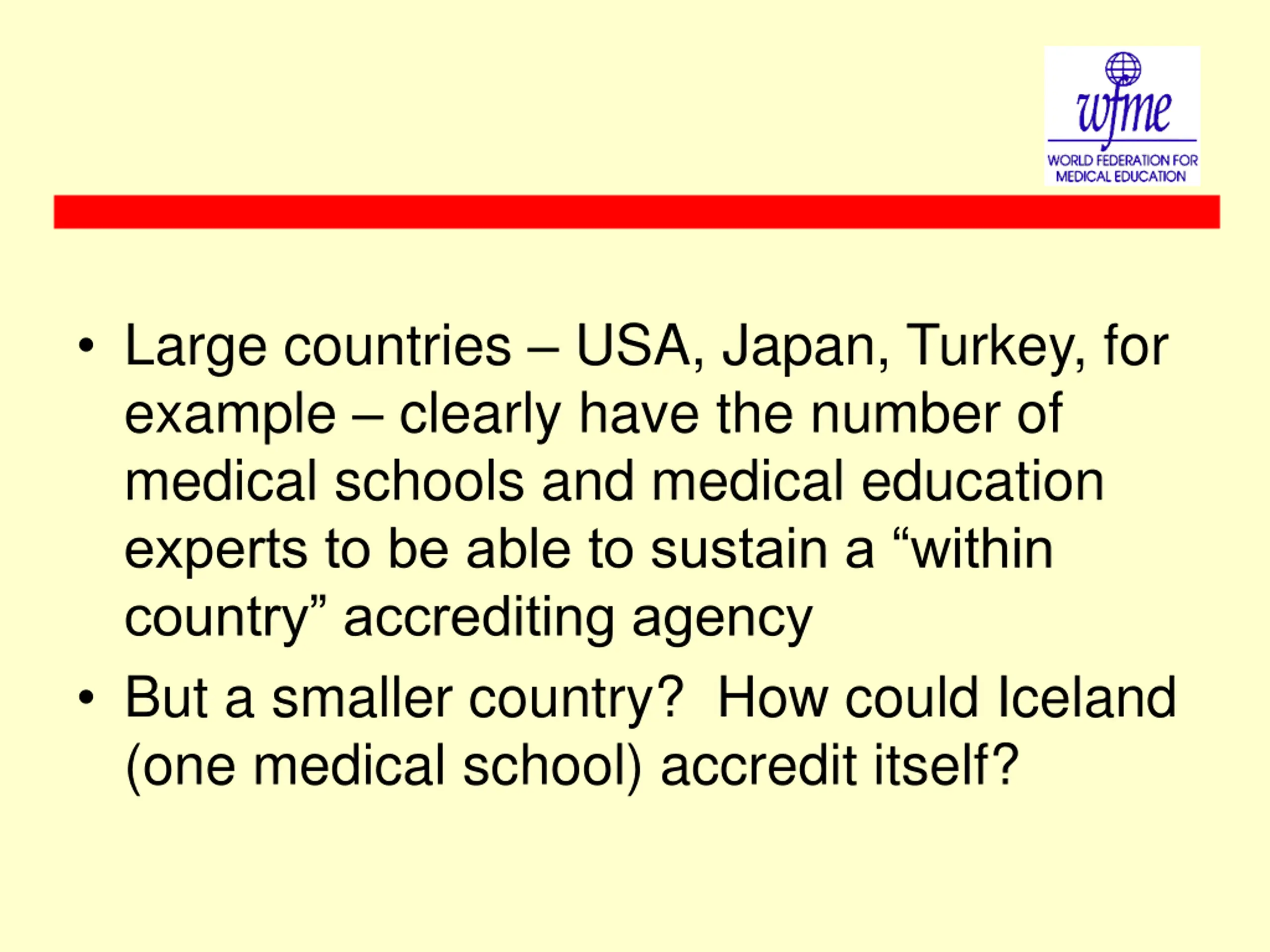 Large countries USA, Japan, Turkey, for example clearly have the number of medical schools and medical education experts to be able to sustain a within country accrediting agency But a smaller country? How could Iceland (one medical school) accredit itself?