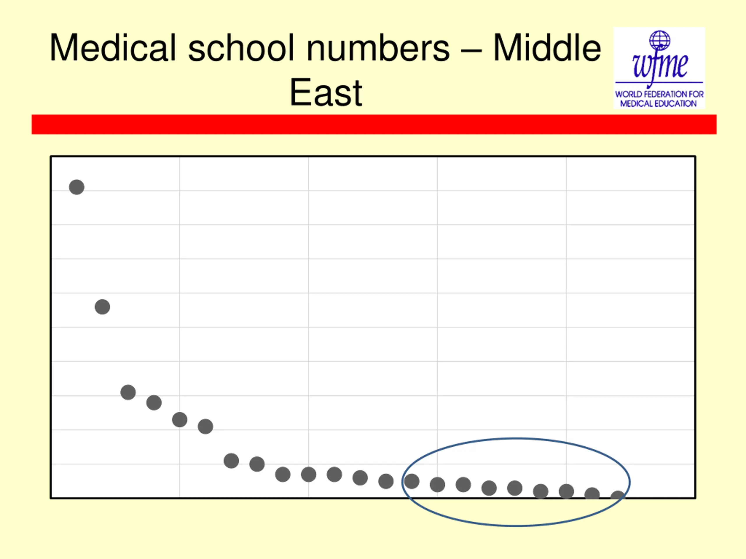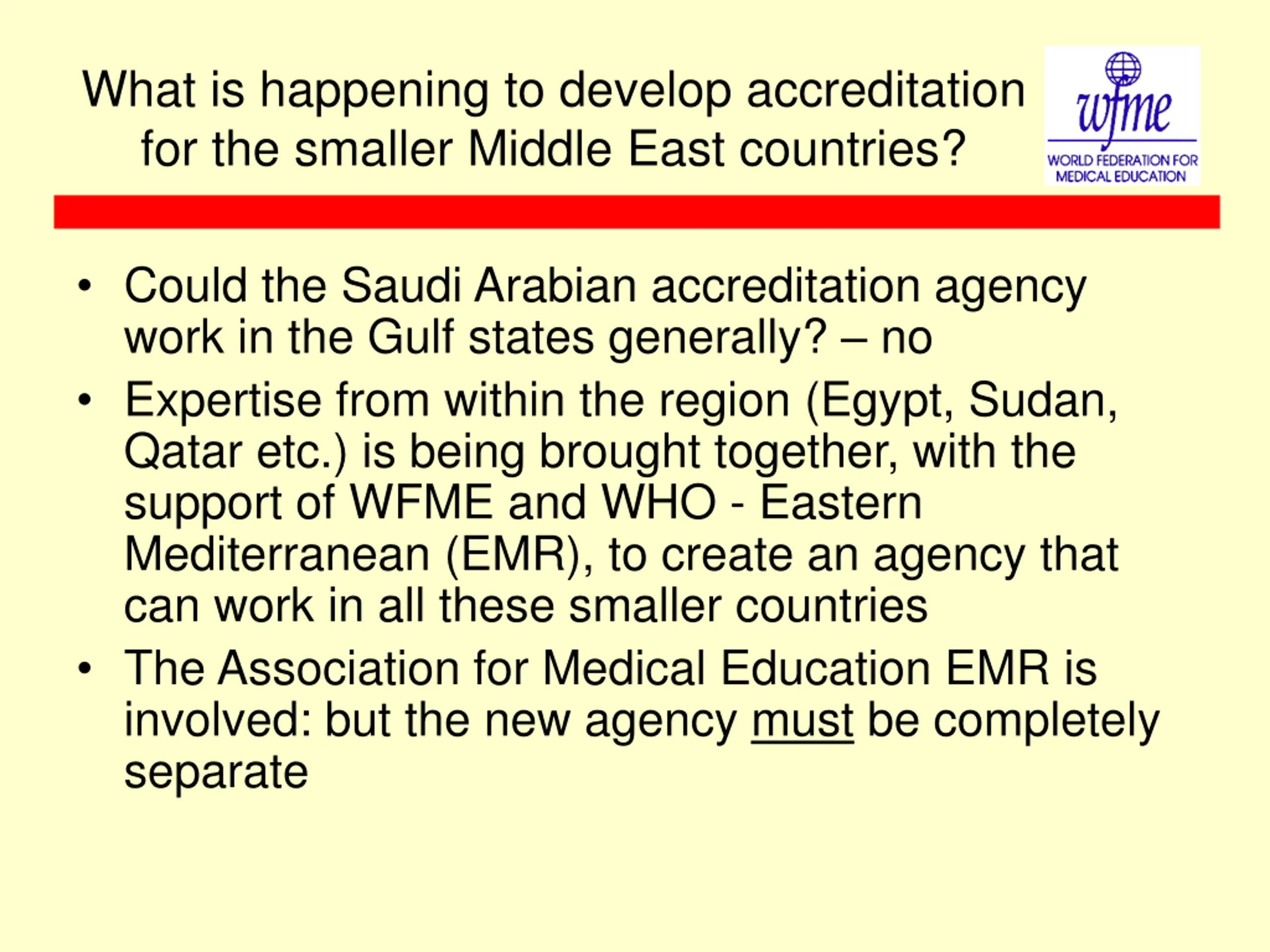 What is happening to develop accreditation for the smaller Middle East countries? Could the Saudi Arabian accreditation agency work in the Gulf states generally? no Expertise from within the region (Egypt, Sudan, Qatar etc.) is being brought together, with the support of WFME and WHO - Eastern Mediterranean (EMR), to create an agency that can work in all these smaller countries The Association for Medical Education EMR is involved: but the new agency must be completely separate