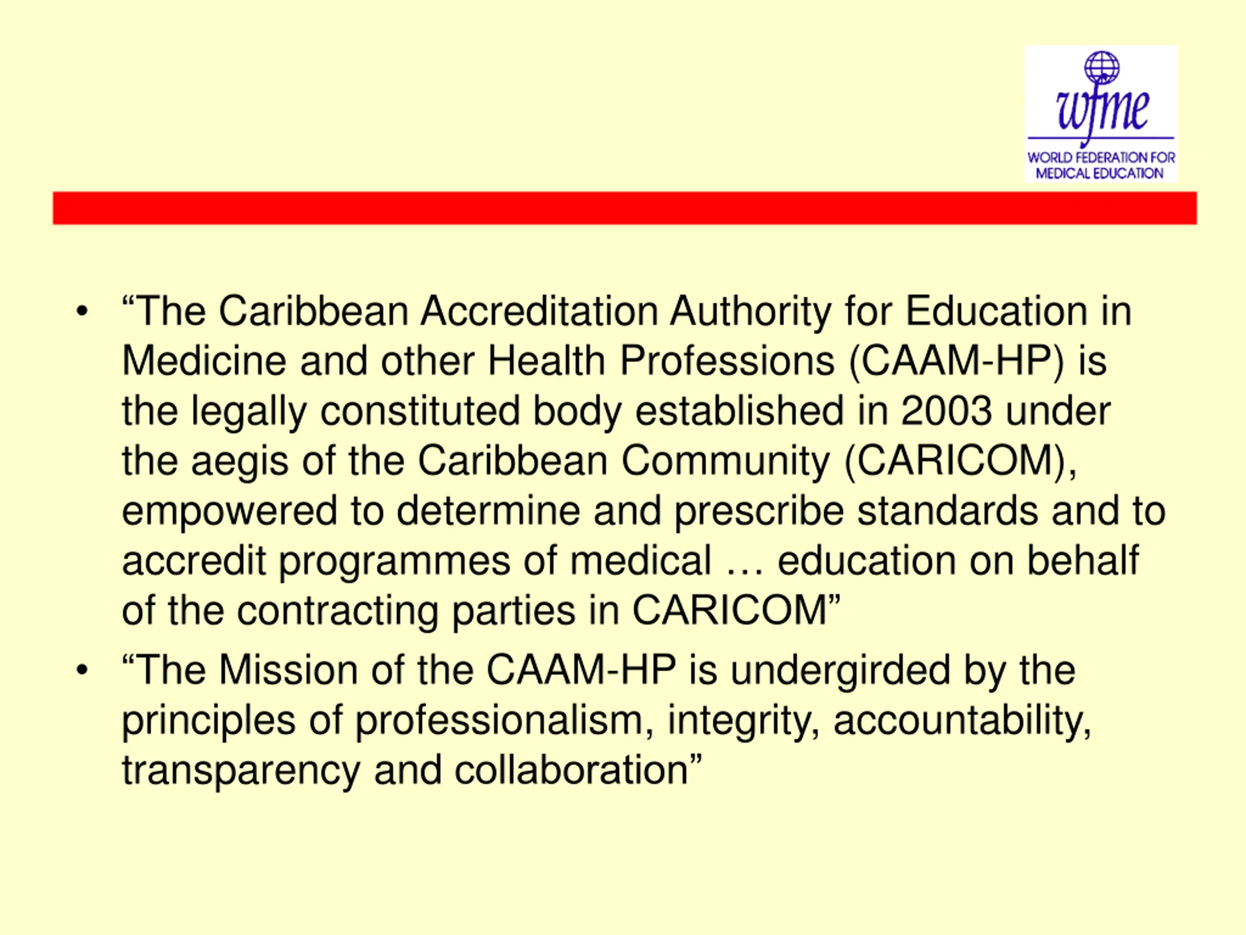 The Caribbean Accreditation Authority for Education in Medicine and other Health Professions (CAAM-HP) is the legally constituted body established in 2003 under the aegis of the Caribbean Community (CARICOM), empowered to determine and prescribe standards and to accredit programmes of medical education on behalf of the contracting parties in CARICOM The Mission of the CAAM-HP is undergirded by the principles of professionalism, integrity, accountability, transparency and collaboration