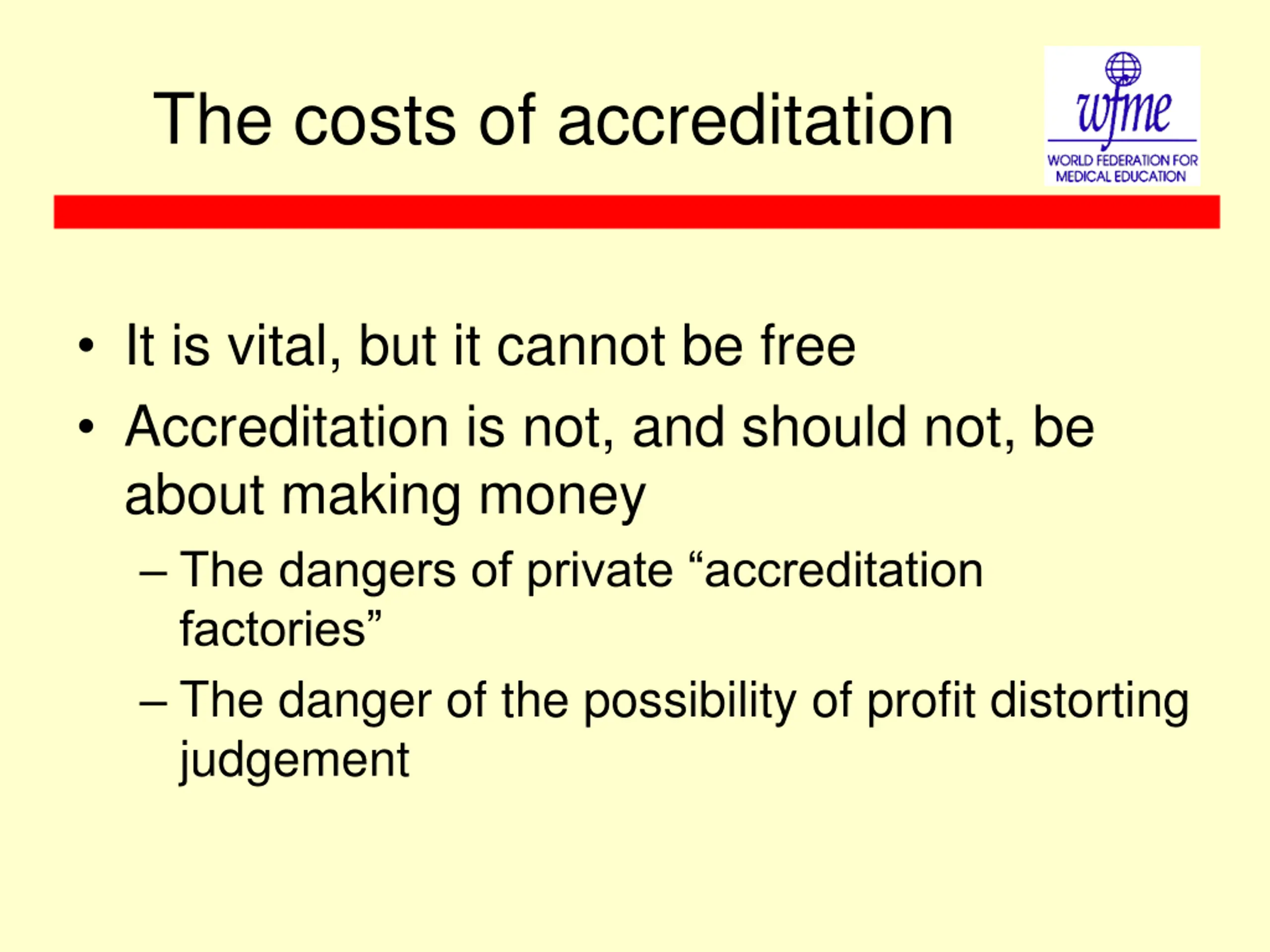 The costs of accreditation It is vital, but it cannot be free Accreditation is not, and should not, be about making money The dangers of private accreditation factories The danger of the possibility of profit distorting judgement