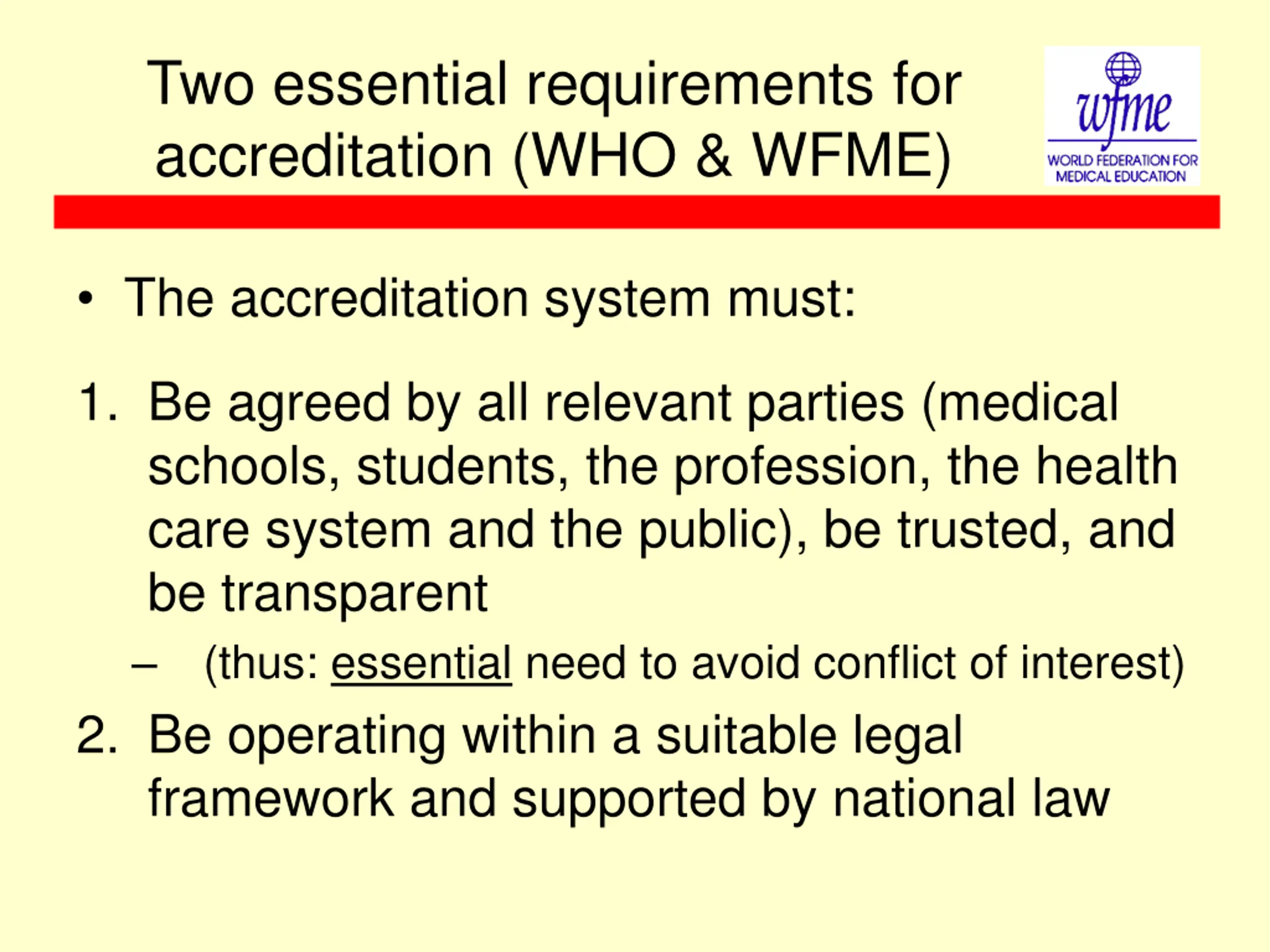 Two essential requirements for accreditation (WHO & WFME) The accreditation system must: 1. Be agreed by all relevant parties (medical schools, students, the profession, the health care system and the public), be trusted, and be transparent (thus: essential need to avoid conflict of interest) 2. Be operating within a suitable legal framework and supported by national law