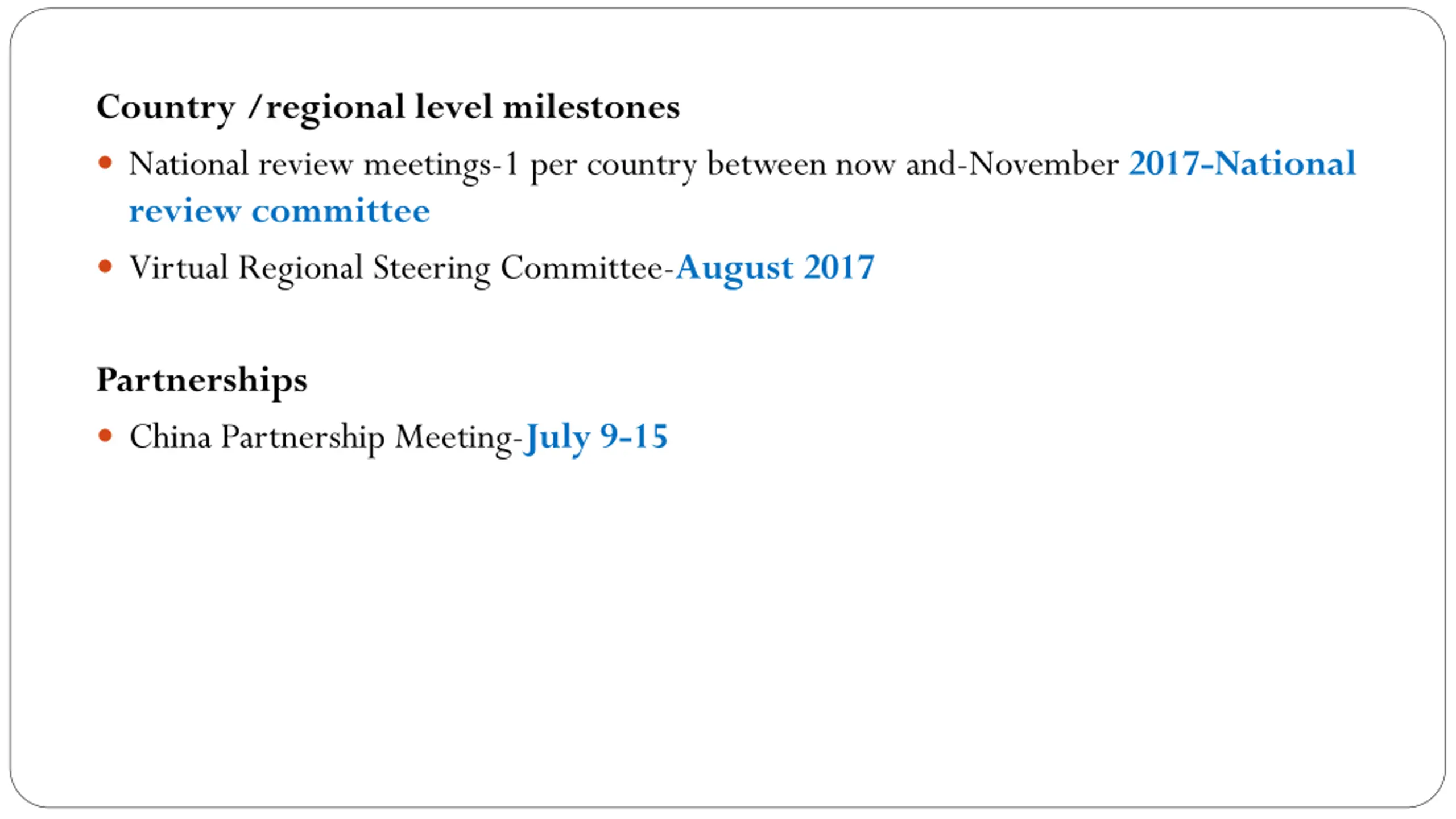 Country /regional level milestones National review meetings-1 per country between now and-November 2017-National review committee Virtual Regional Steering Committee-August 2017 Partnerships China Partnership Meeting-July 9-15