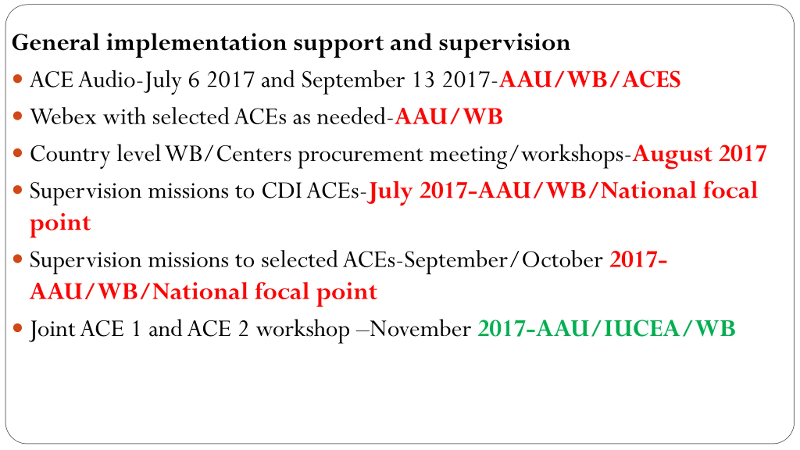 General implementation support and supervision ACE Audio-July 6 2017 and September 13 2017-AAU/WB/ACES Webex with selected ACEs as needed-AAU/WB Country level WB/Centers procurement meeting/workshops-August 2017 Supervision missions to CDI ACEs-July 2017-AAU/WB/National focal point Supervision missions to selected ACEs-September/October 2017- AAU/WB/National focal point Joint ACE 1 and ACE 2 workshop November 2017-AAU/IUCEA/WB
